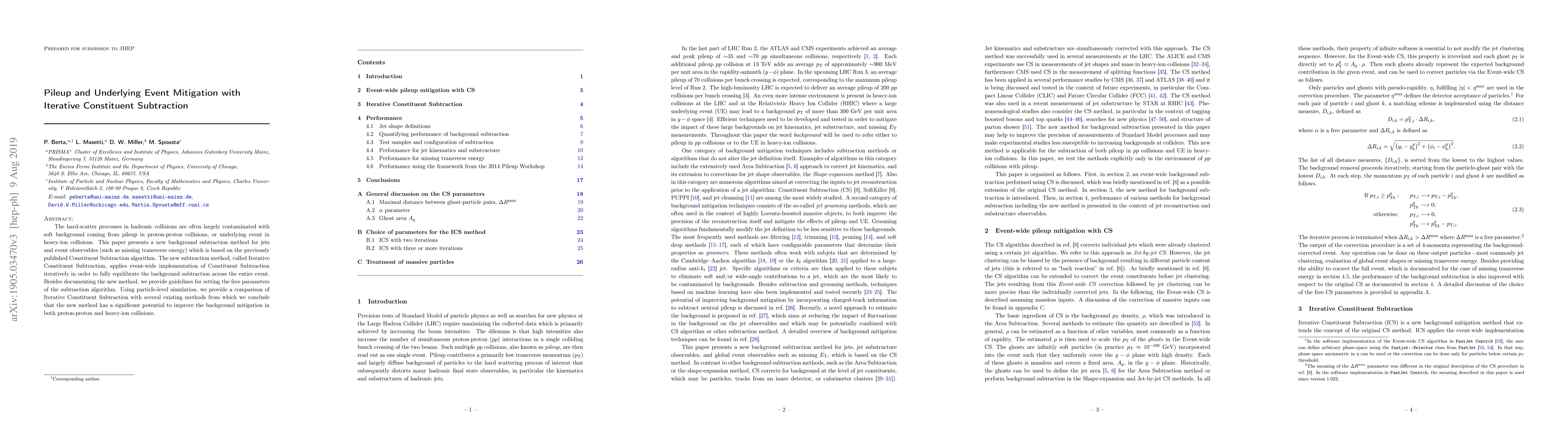 The hard-scatter processes in hadronic collisions are often largely contaminated with soft background coming from pileup in proton-proton collisions, or underlying event in heavy-ion collisions. This paper presents a new background subtraction method for jets and event observables (such as missing transverse energy) which is based on the previously published Constituent Subtraction algorithm. The new subtraction method, called Iterative Constituent Subtraction, applies event-wide implementation of Constituent Subtraction iteratively in order to fully equilibrate the background subtraction across the entire event. Besides documenting the new method, we provide guidelines for setting the free parameters of the subtraction algorithm. Using particle-level simulation, we provide a comparison of Iterative Constituent Subtraction with several existing methods from which we conclude that the new method has a significant potential to improve the background mitigation in both proton-proton and heavy-ion collisions.