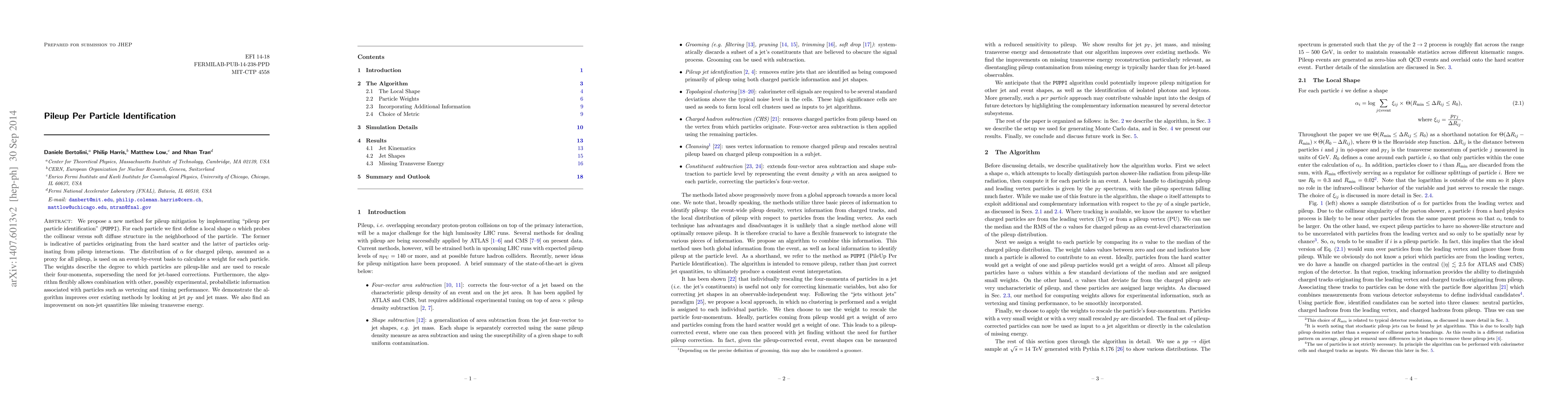 This paper introduces a novel "pileup per particle identification" (PUPPI) method to mitigate pileup effects in particle detection, defining a local shape $\alpha$ to distinguish hard scatter particles from pileup interactions. The method assigns weights to particles based on their pileup-likeness, improving jet $p_T$, jet mass, and missing transverse energy measurements.