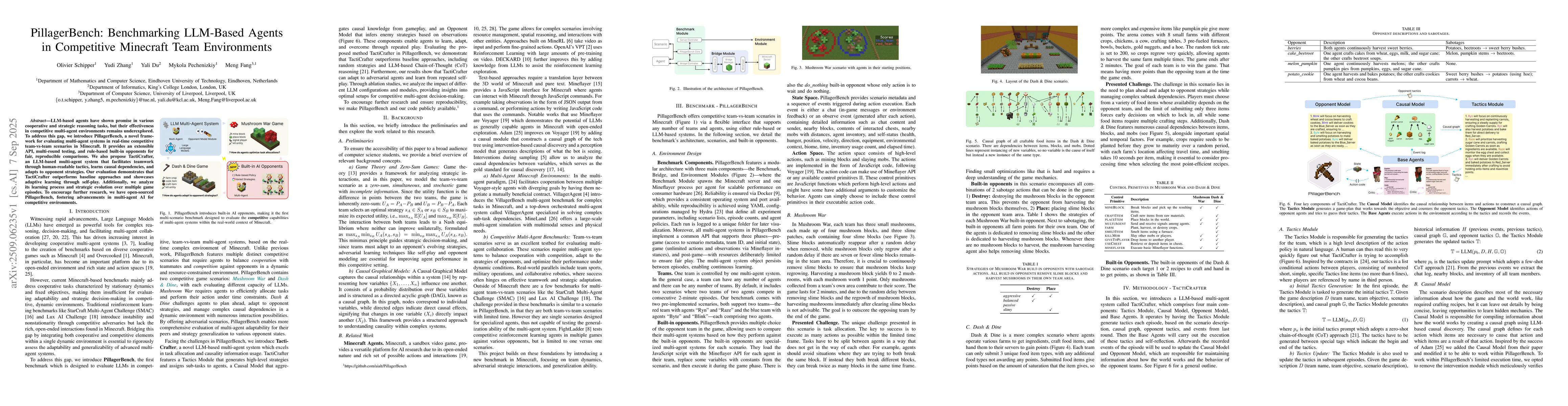 LLM-based agents have shown promise in various cooperative and strategic reasoning tasks, but their effectiveness in competitive multi-agent environments remains underexplored. To address this gap, we introduce PillagerBench, a novel framework for evaluating multi-agent systems in real-time competitive team-vs-team scenarios in Minecraft. It provides an extensible API, multi-round testing, and rule-based built-in opponents for fair, reproducible comparisons. We also propose TactiCrafter, an LLM-based multi-agent system that facilitates teamwork through human-readable tactics, learns causal dependencies, and adapts to opponent strategies. Our evaluation demonstrates that TactiCrafter outperforms baseline approaches and showcases adaptive learning through self-play. Additionally, we analyze its learning process and strategic evolution over multiple game episodes. To encourage further research, we have open-sourced PillagerBench, fostering advancements in multi-agent AI for competitive environments.
