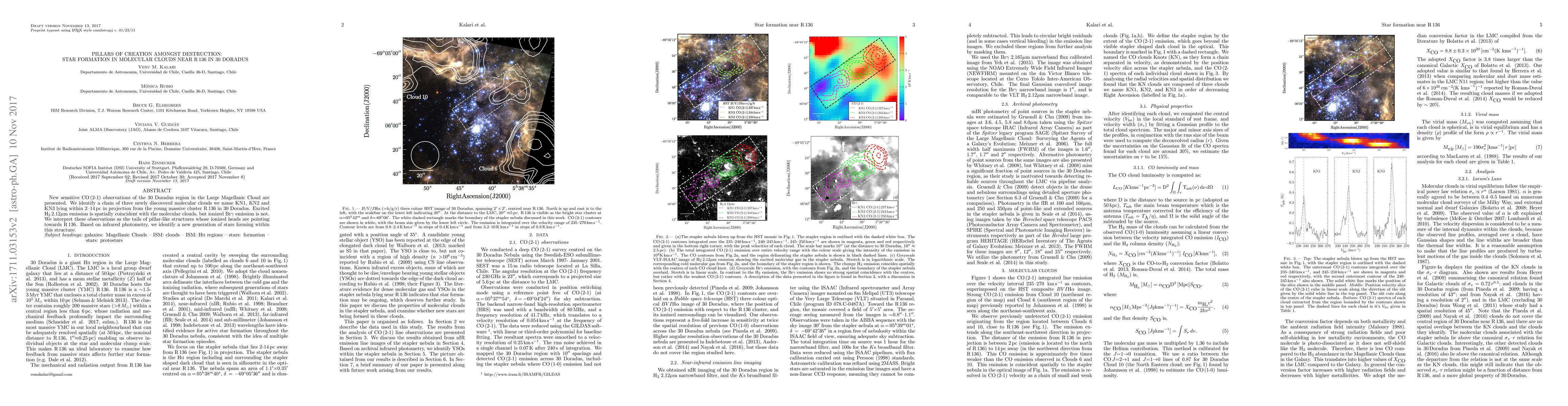 New sensitive CO(2-1) observations of the 30 Doradus region in the Large Magellanic Cloud are presented. We identify a chain of three newly discovered molecular clouds we name KN1, KN2 and KN3 lying within 2--14 pc in projection from the young massive cluster R136 in 30 Doradus. Excited H$_2$ 2.12$\mu$m emission is spatially coincident with the molecular clouds, but ionized Br$\gamma$ emission is not. We interpret these observations as the tails of pillar-like structures whose ionized heads are pointing towards R136. Based on infrared photometry, we identify a new generation of stars forming within this structure.
