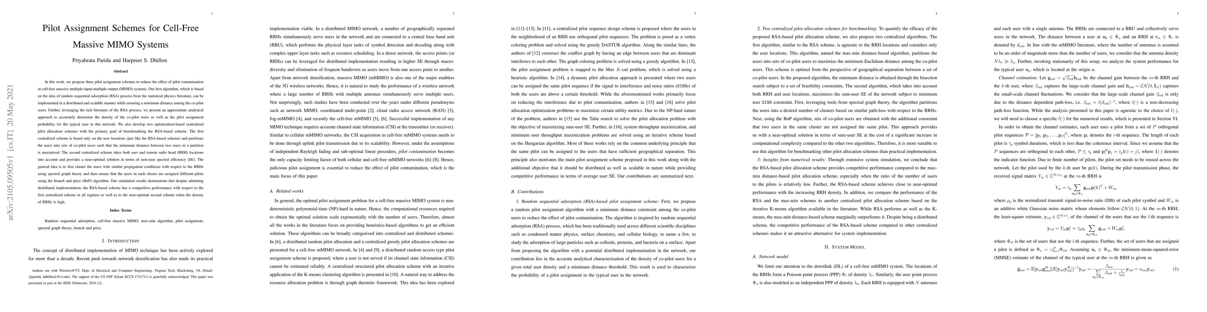 In this work, we propose three pilot assignment schemes to reduce the effect of pilot contamination in cell-free massive multiple-input-multiple-output (MIMO) systems. Our first algorithm, which is based on the idea of random sequential adsorption (RSA) process from the statistical physics literature, can be implemented in a distributed and scalable manner while ensuring a minimum distance among the co-pilot users. Further, leveraging the rich literature of the RSA process, we present an approximate analytical approach to accurately determine the density of the co-pilot users as well as the pilot assignment probability for the typical user in this network. We also develop two optimization-based centralized pilot allocation schemes with the primary goal of benchmarking the RSA-based scheme. The first centralized scheme is based only on the user locations (just like the RSA-based scheme) and partitions the users into sets of co-pilot users such that the minimum distance between two users in a partition is maximized. The second centralized scheme takes both user and remote radio head (RRH) locations into account and provides a near-optimal solution in terms of sum-user spectral efficiency (SE). The general idea is to first cluster the users with similar propagation conditions with respect to the RRHs using spectral graph theory and then ensure that the users in each cluster are assigned different pilots using the branch and price (BnP) algorithm. Our simulation results demonstrate that despite admitting distributed implementation, the RSA-based scheme has a competitive performance with respect to the first centralized scheme in all regimes as well as to the near-optimal second scheme when the density of RRHs is high.