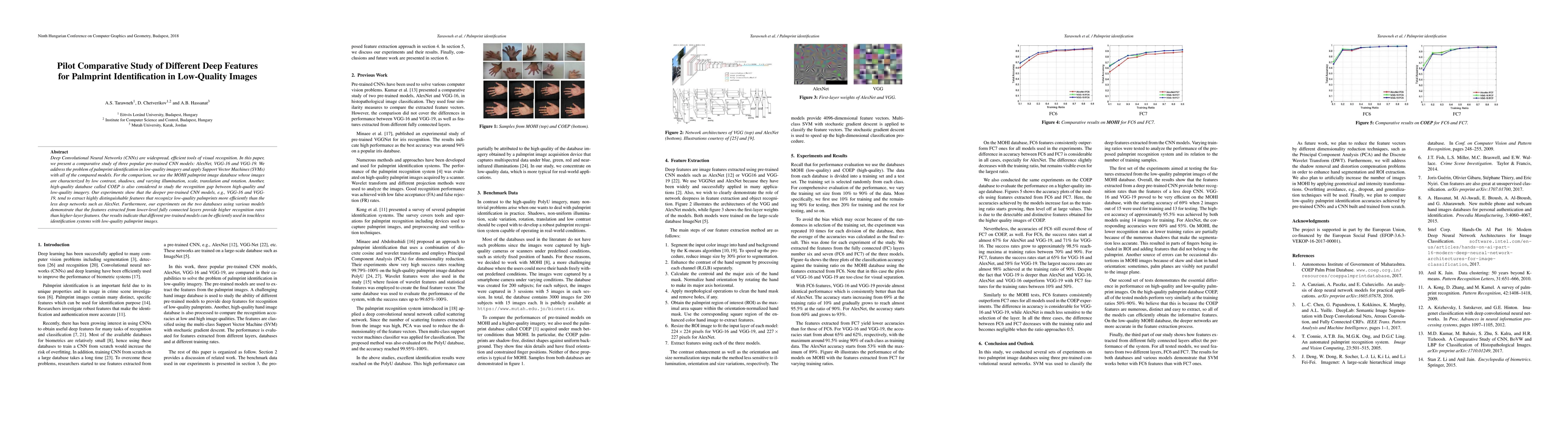 This research paper investigates the effectiveness of three popular pre-trained CNN models—AlexNet, VGG-16, and VGG-19—for palmprint identification in low-quality images. The study compares these models using Support Vector Machines on two databases, highlighting that deeper networks, like VGG-16 and VGG-19, perform better in extracting features from low-quality images. For more details, refer directly to the original paper.