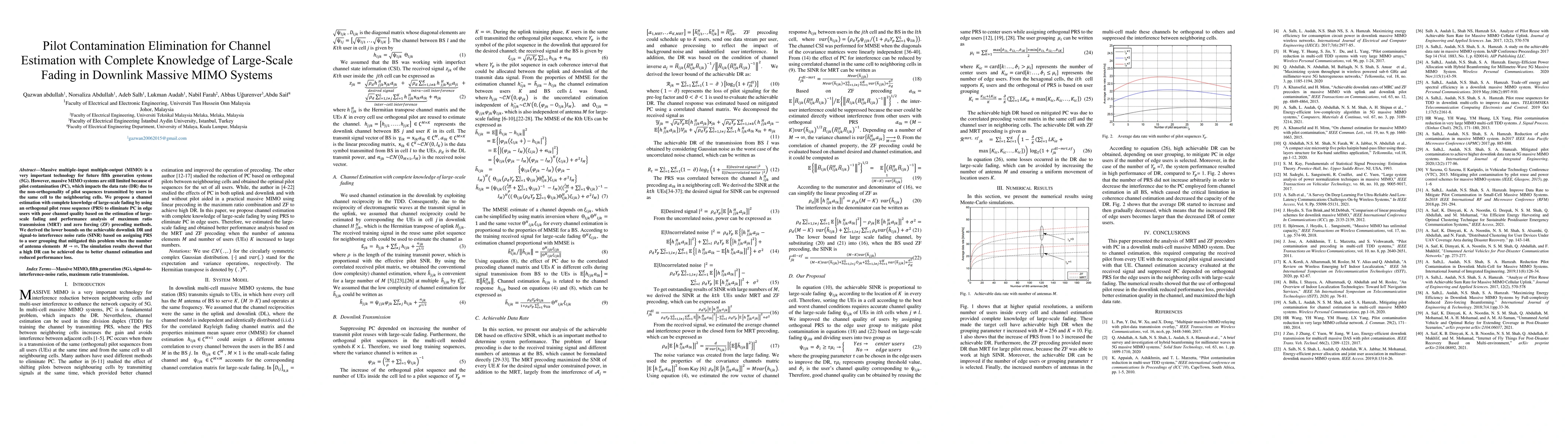 Massive multiple-input multiple-output is a very important technology for future fifth-generation systems. However, massive massive multiple input multiple output systems are still limited because of pilot contamination, impacting the data rate due to the non-orthogonality of pilot sequences transmitted by users in the same cell to the neighboring cells. We propose a channel estimation with complete knowledge of large-scale fading by using an orthogonal pilot reuse sequence to eliminate PC in edge users with poor channel quality based on the estimation of large-scale fading and performance analysis of maximum ratio transmission and zero forcing precoding methods. We derived the lower bounds on the achievable downlink DR and signal-to-interference noise ratio based on assigning PRS to a user grouping that mitigated this problem when the number of antenna elements approaches infinity The simulation results showed that a high DR can be achieved due to better channel estimation and reduced performance loss
