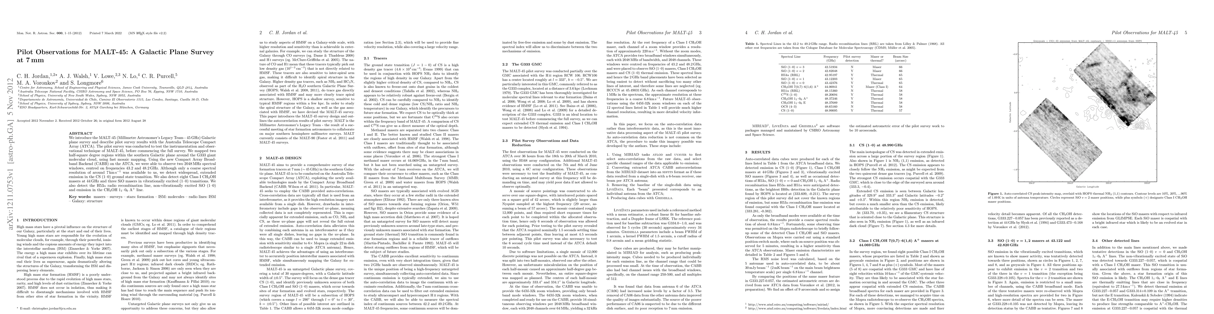 We introduce the MALT-45 (Millimetre Astronomer's Legacy Team - 45 GHz) Galactic plane survey and describe pilot survey results with the Australia Telescope Compact Array (ATCA). The pilot survey was conducted to test the instrumentation and observational technique of MALT-45, before commencing the full survey. We mapped two half-square degree regions within the southern Galactic plane around the G333 giant molecular cloud, using fast mosaic mapping. Using the new Compact Array Broadband Backend (CABB) on the ATCA, we were able to observe two 2048 MHz spectral windows, centred on frequencies 43.2 and 48.2 GHz. Although only a coarse spectral resolution of around 7 km/s was available to us, we detect widespread, extended emission in the CS (1-0) ground state transition. We also detect eight Class I CH3OH masers at 44 GHz and three SiO masers in vibrationally excited (1-0) transitions. We also detect the H53a radio recombination line, non-vibrationally excited SiO (1-0) and emission in the CH3OH 1_1-0_0 A+ line.