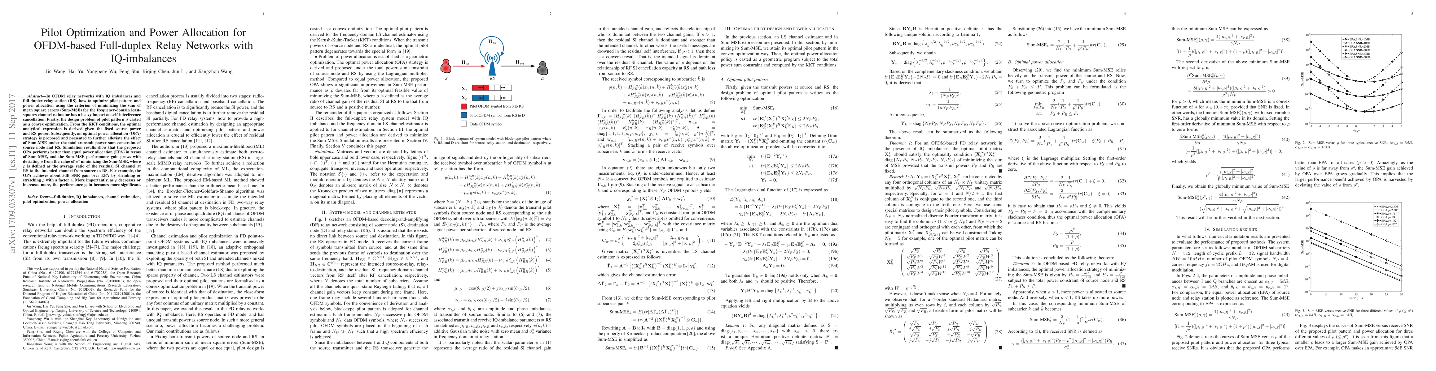 This paper proposes an optimization method for pilot pattern and power allocation in OFDM-based full-duplex relay networks with IQ imbalances, aiming to minimize the sum of mean square errors (Sum-MSE). The optimal pilot pattern and power allocation strategies significantly improve self-interference cancellation and outperform equal power allocation in terms of Sum-MSE.