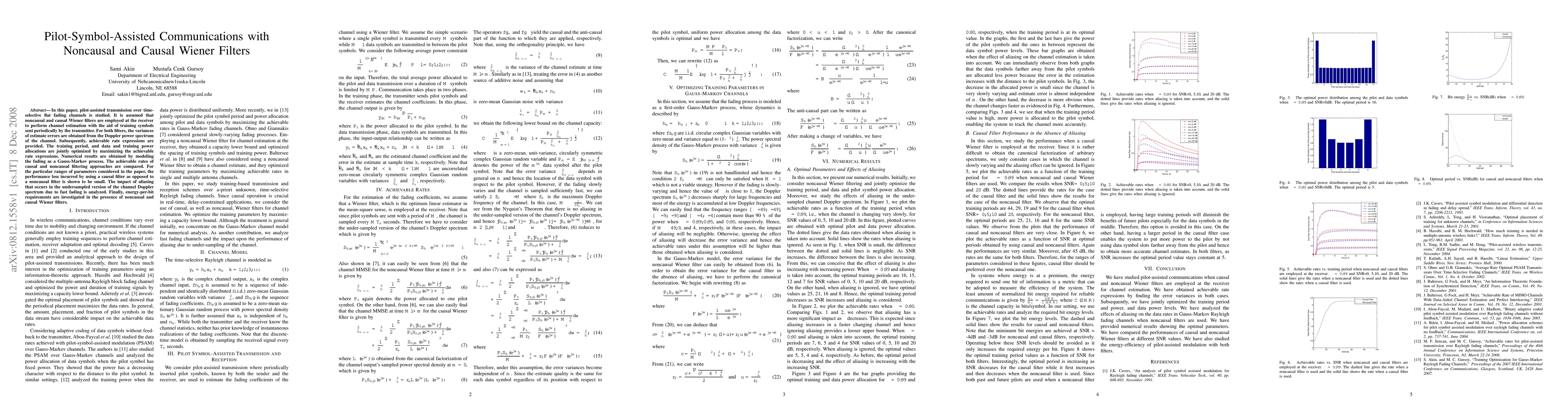 Researchers studied pilot-assisted transmission over fading channels using noncausal and causal Wiener filters to optimize channel estimation and data transmission. They found that noncausal filtering approaches result in better performance than causal filtering for certain ranges of parameters.