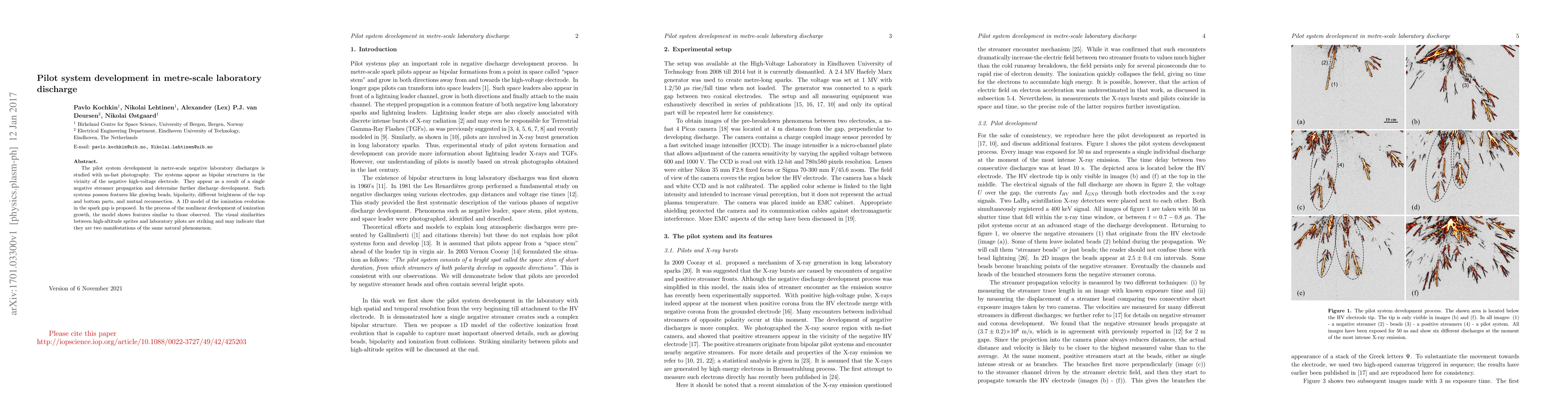 The pilot system development in metre-scale negative laboratory discharges is studied with ns-fast photography. The systems appear as bipolar structures in the vicinity of the negative high-voltage electrode. They appear as a result of a single negative streamer propagation and determine further discharge development. Such systems possess features like glowing beads, bipolarity, different brightness of the top and bottom parts, and mutual reconnection. A 1D model of the ionization evolution in the spark gap is proposed. In the process of the nonlinear development of ionization growth, the model shows features similar to those observed. The visual similarities between high-altitude sprites and laboratory pilots are striking and may indicate that they are two manifestations of the same natural phenomenon.