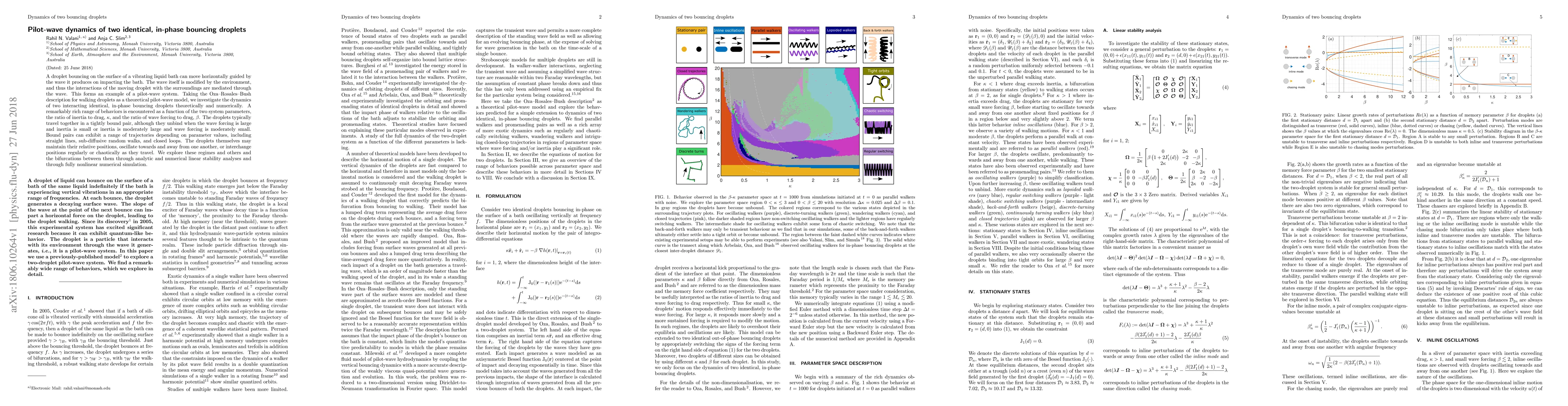 This research investigates the movement of two identical, in-phase bouncing droplets on a vibrating liquid bath, modeling it as a pilot-wave system. The droplets' interactions are mediated through the waves they generate. The study reveals a range of behaviors depending on the parameters k{appa} (ratio of inertia to drag) and {eta} (ratio of wave forcing to drag). These behaviors include tightly bound pairs, unbinding, various trajectories, and position exchanges, explored through analytic and numerical methods.