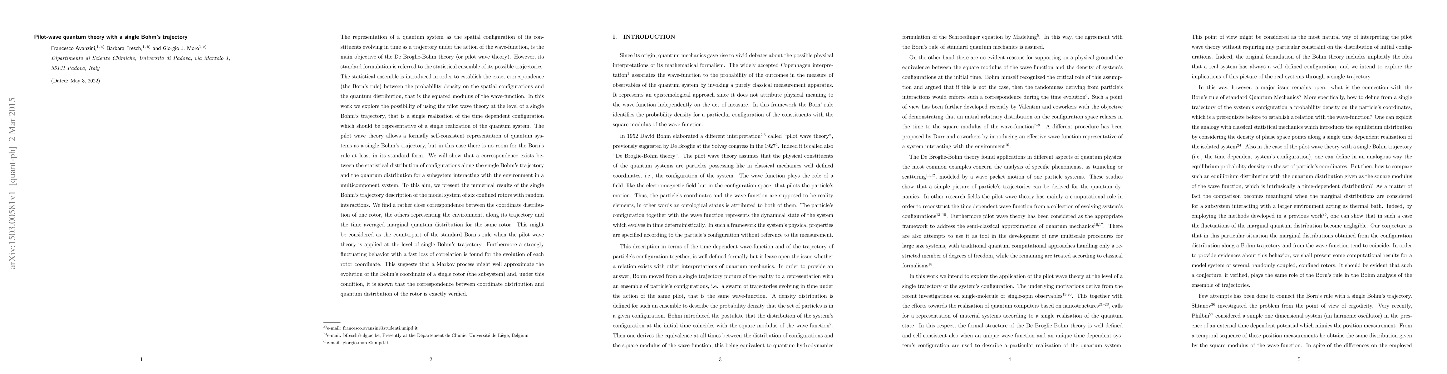This paper explores the pilot-wave theory using a single Bohm's trajectory instead of a statistical ensemble, demonstrating a correspondence between the single trajectory's configuration distribution and the quantum distribution for subsystems in a multicomponent system. Numerical results on six confined rotors show a close match between the trajectory's coordinate distribution and the marginal quantum distribution, suggesting a Markov process approximation.