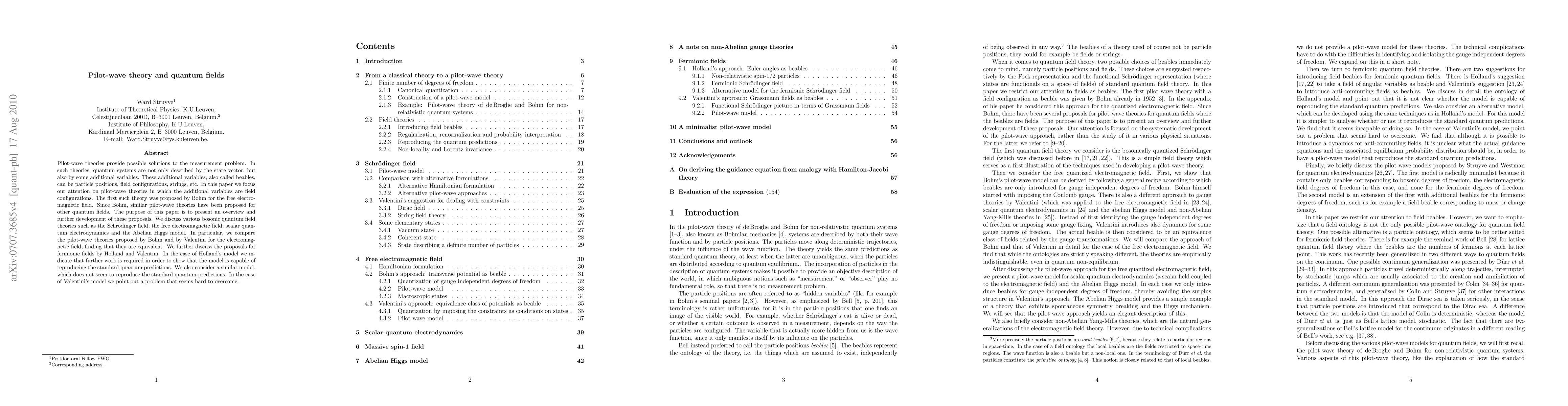 This paper provides an overview of pilot-wave theories applied to quantum fields, comparing Bohm's and Valentini's theories for the electromagnetic field and discussing the challenges in extending these models to fermionic fields. It highlights the equivalence of Bohm and Valentini's models for the electromagnetic field but notes unresolved issues in Holland's fermionic model and a problematic similar model.