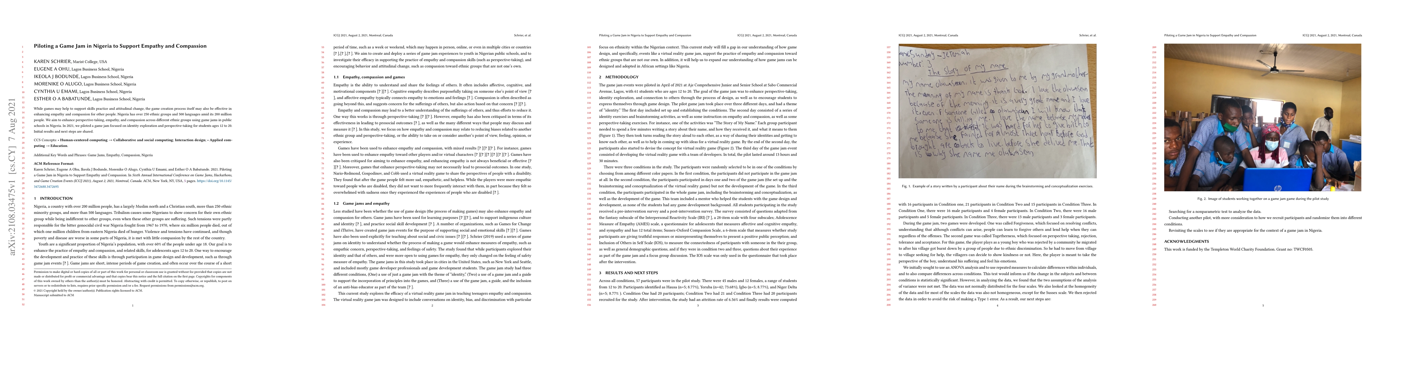 This study piloted a game jam in Nigerian public schools to enhance empathy and compassion among students from diverse ethnic backgrounds. Preliminary results suggest the game creation process effectively promotes perspective-taking and intergroup understanding.