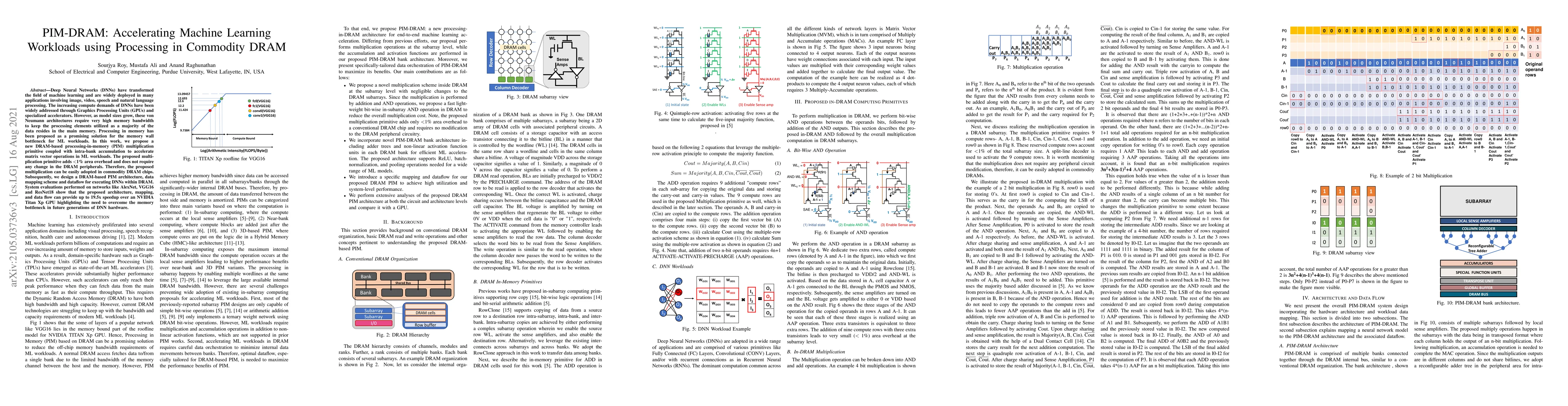 This paper proposes a DRAM-based processing-in-memory (PIM) multiplication primitive to accelerate matrix-vector operations in machine learning workloads, achieving up to 19.5x speedup over GPU implementations without requiring changes to DRAM peripherals. The approach aims to address the memory wall bottleneck in deep neural networks by integrating computation directly into commodity DRAM.
