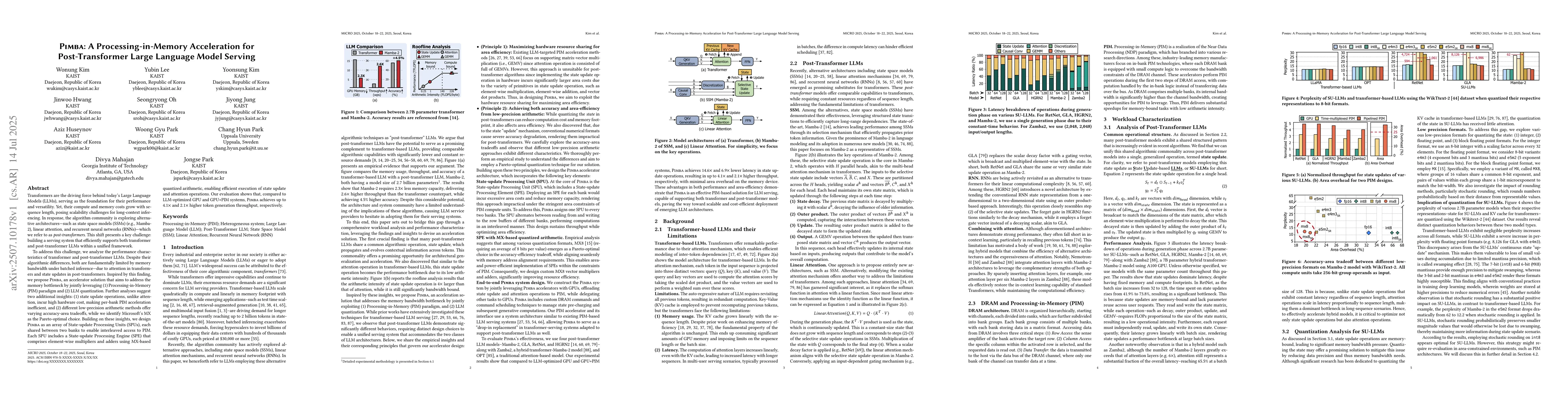 Transformers are the driving force behind today's Large Language Models (LLMs), serving as the foundation for their performance and versatility. Yet, their compute and memory costs grow with sequence length, posing scalability challenges for long-context inferencing. In response, the algorithm community is exploring alternative architectures, such as state space models (SSMs), linear attention, and recurrent neural networks (RNNs), which we refer to as post-transformers. This shift presents a key challenge: building a serving system that efficiently supports both transformer and post-transformer LLMs within a unified framework. To address this challenge, we analyze the performance characteristics of transformer and post-transformer LLMs. Despite their algorithmic differences, both are fundamentally limited by memory bandwidth under batched inference due to attention in transformers and state updates in post-transformers. Further analyses suggest two additional insights: (1) state update operations, unlike attention, incur high hardware cost, making per-bank PIM acceleration inefficient, and (2) different low-precision arithmetic methods offer varying accuracy-area tradeoffs, while we identify Microsoft's MX as the Pareto-optimal choice. Building on these insights, we design Pimba as an array of State-update Processing Units (SPUs), each shared between two banks to enable interleaved access to PIM. Each SPU includes a State-update Processing Engine (SPE) that comprises element-wise multipliers and adders using MX-based quantized arithmetic, enabling efficient execution of state update and attention operations. Our evaluation shows that, compared to LLM-optimized GPU and GPU+PIM systems, Pimba achieves up to 3.2x and 2.1x higher token generation throughput, respectively.