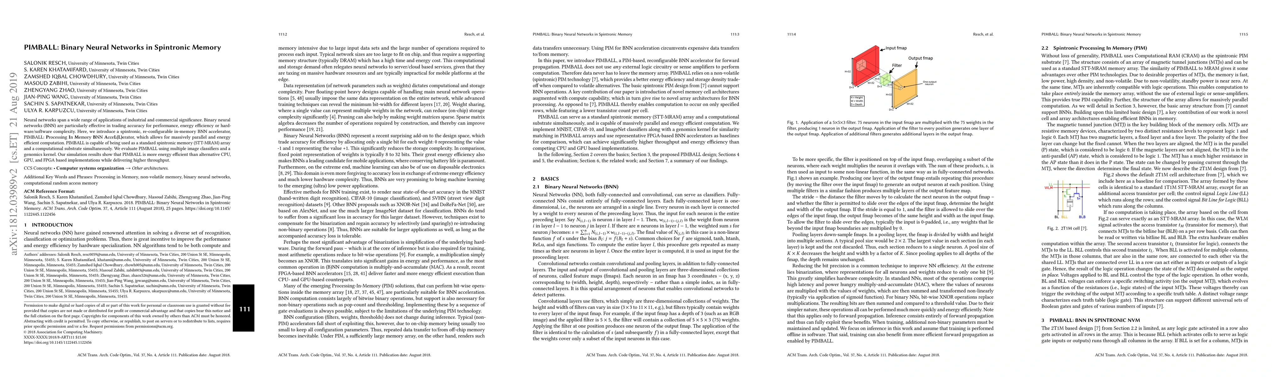Title: PIMBALL: Binary Neural Networks in Spintronic Memory Summary: This paper introduces PIMBALL, a spintronic in-memory accelerator for binary neural networks, demonstrating its energy efficiency and higher throughput compared to CPU, GPU, and FPGA implementations. PIMBALL leverages reconfigurable spintronic memory to perform massively parallel computations.