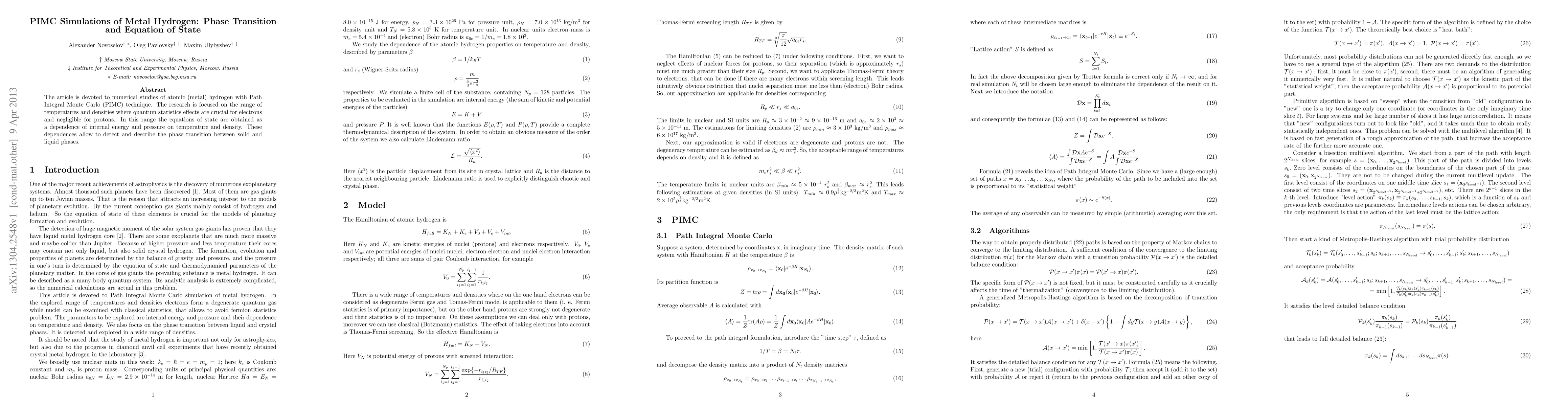 The article is devoted to numerical studies of atomic (metal) hydrogen with Path Integral Monte Carlo (PIMC) technique. The research is focused on the range of temperatures and densities where quantum statistics effects are crucial for electrons and negligible for protons. In this range the equations of state are obtained as a dependence of internal energy and pressure on temperature and density. These dependences allow to detect and describe the phase transition between solid and liquid phases.