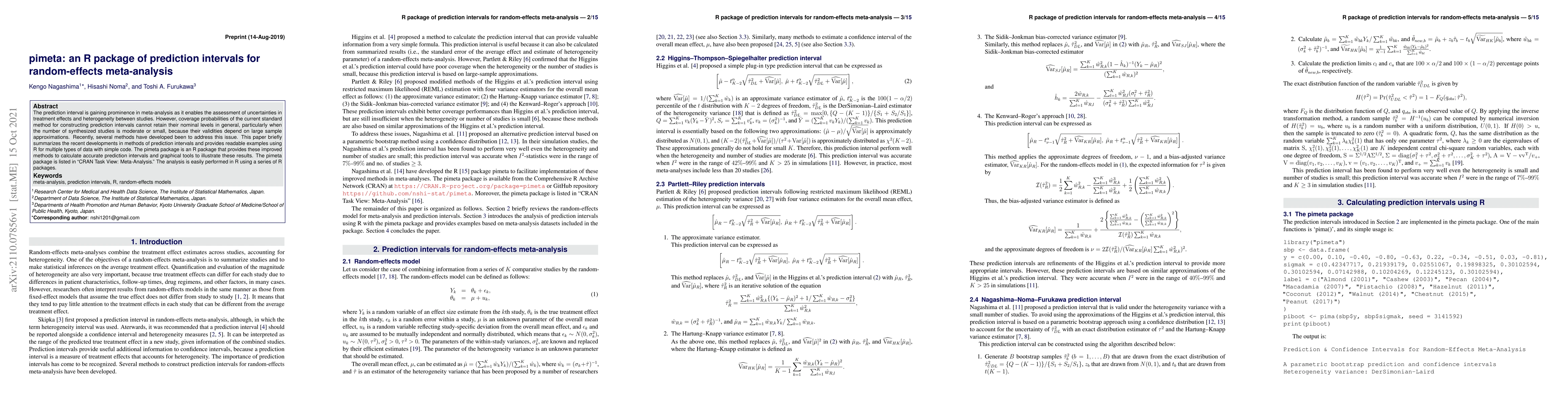 The pimeta R package offers improved methods for calculating accurate prediction intervals in random-effects meta-analysis, addressing issues with standard methods that fail under moderate or small sample sizes. It provides graphical tools and simple code examples for various data types.