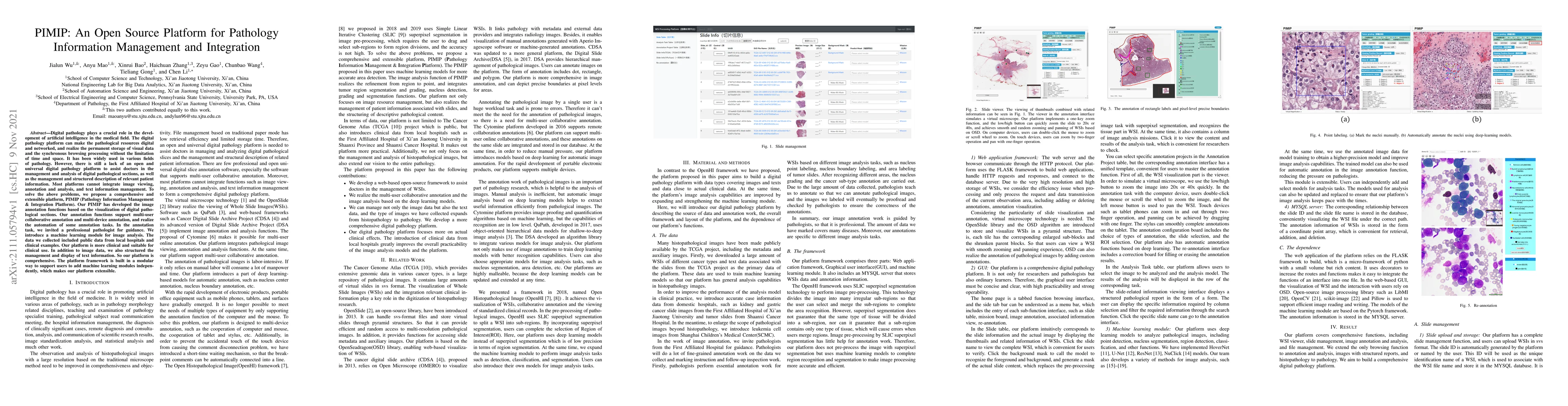PIMIP is an open-source platform designed for managing and integrating digital pathology data, featuring image annotation, multi-user collaboration, and machine learning for analysis. It aims to provide a comprehensive solution for pathology information management, supporting both image and text data integration.