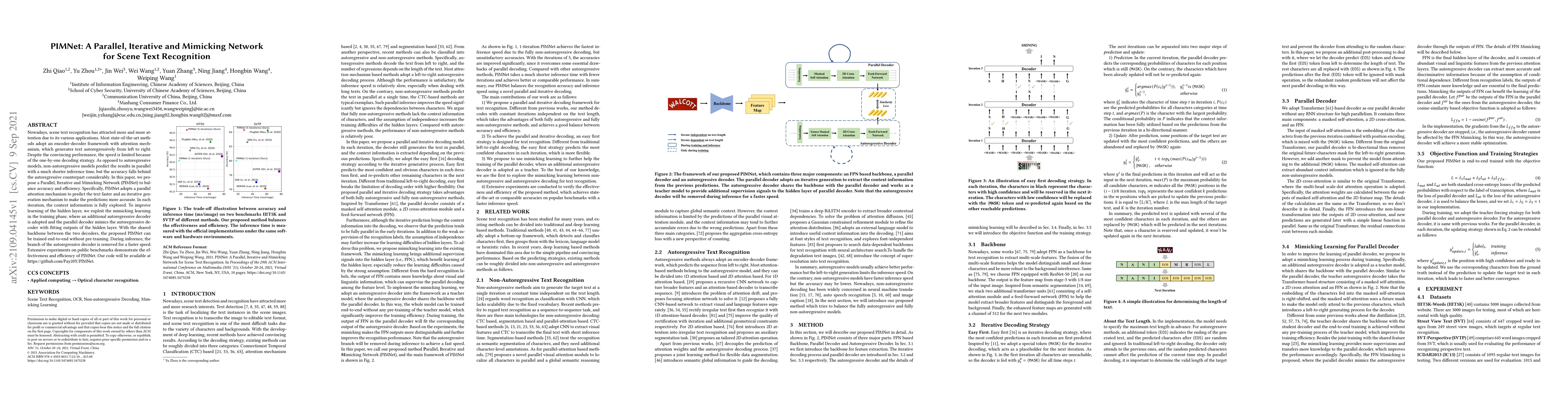PIMNet proposes a Parallel, Iterative and Mimicking Network for scene text recognition to balance accuracy and speed. It uses a parallel attention mechanism and iterative generation to improve both efficiency and prediction accuracy.