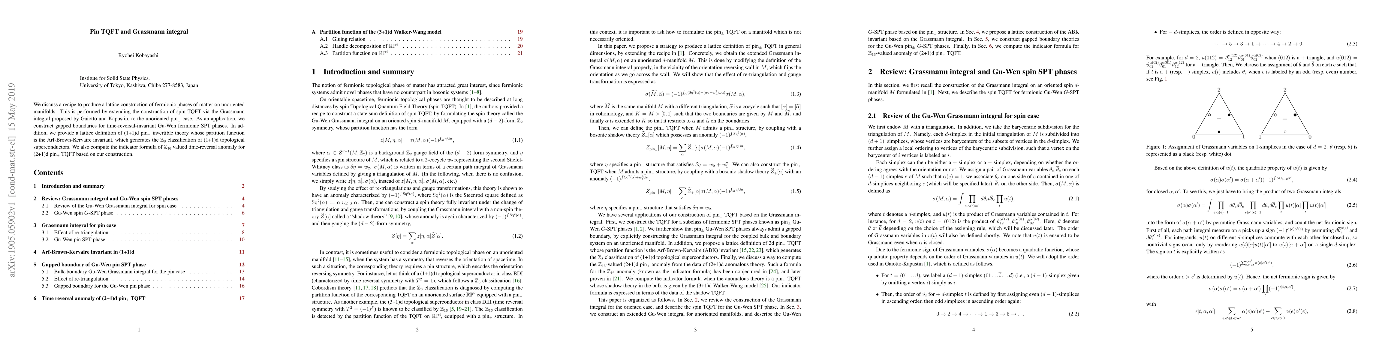 We discuss a recipe to produce a lattice construction of fermionic phases of matter on unoriented manifolds. This is performed by extending the construction of spin TQFT via the Grassmann integral proposed by Gaiotto and Kapustin, to the unoriented pin$_\pm$ case. As an application, we construct gapped boundaries for time-reversal-invariant Gu-Wen fermionic SPT phases. In addition, we provide a lattice definition of (1+1)d pin$_-$ invertible theory whose partition function is the Arf-Brown-Kervaire invariant, which generates the $\mathbb{Z}_8$ classification of (1+1)d topological superconductors. We also compute the indicator formula of $\mathbb{Z}_{16}$ valued time-reversal anomaly for (2+1)d pin$_+$ TQFT based on our construction.