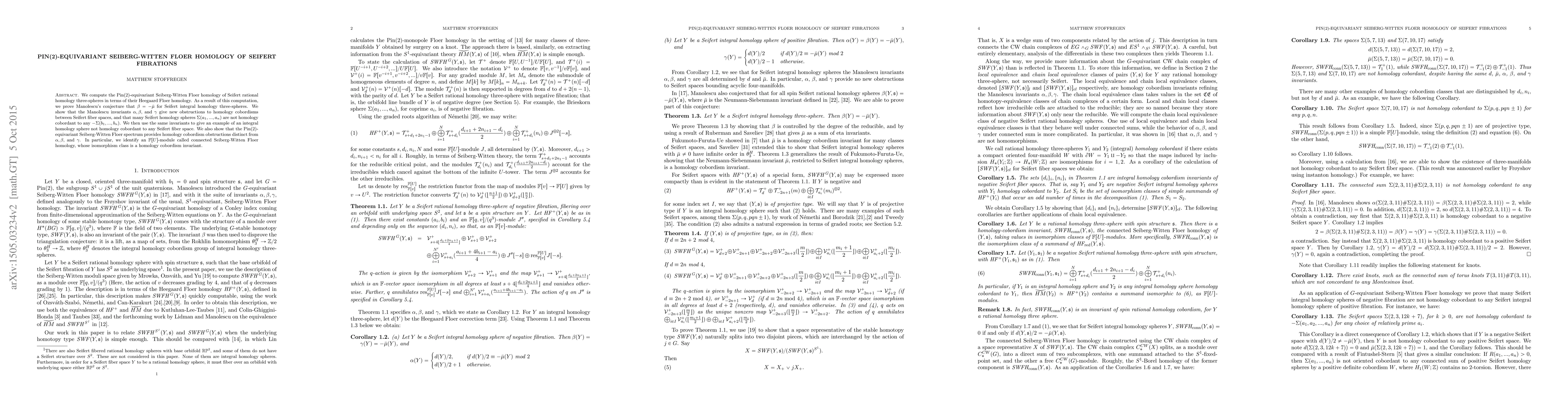 We compute the $\mathrm{Pin}(2)$-equivariant Seiberg-Witten Floer homology of Seifert rational homology three-spheres in terms of their Heegaard Floer homology. As a result of this computation, we prove Manolescu's conjecture that $\beta=-\bar{\mu}$ for Seifert integral homology three-spheres. We show that the Manolescu invariants $\alpha, \beta,$ and $\gamma$ give new obstructions to homology cobordisms between Seifert fiber spaces, and that many Seifert homology spheres $\Sigma(a_1,...,a_n)$ are not homology cobordant to any $-\Sigma(b_1,...,b_n)$. We then use the same invariants to give an example of an integral homology sphere not homology cobordant to any Seifert fiber space. We also show that the $\mathrm{Pin}(2)$-equivariant Seiberg-Witten Floer spectrum provides homology cobordism obstructions distinct from $\alpha,\beta,$ and $\gamma$. In particular, we identify an $\mathbb{F}[U]$-module called connected Seiberg-Witten Floer homology, whose isomorphism class is a homology cobordism invariant.