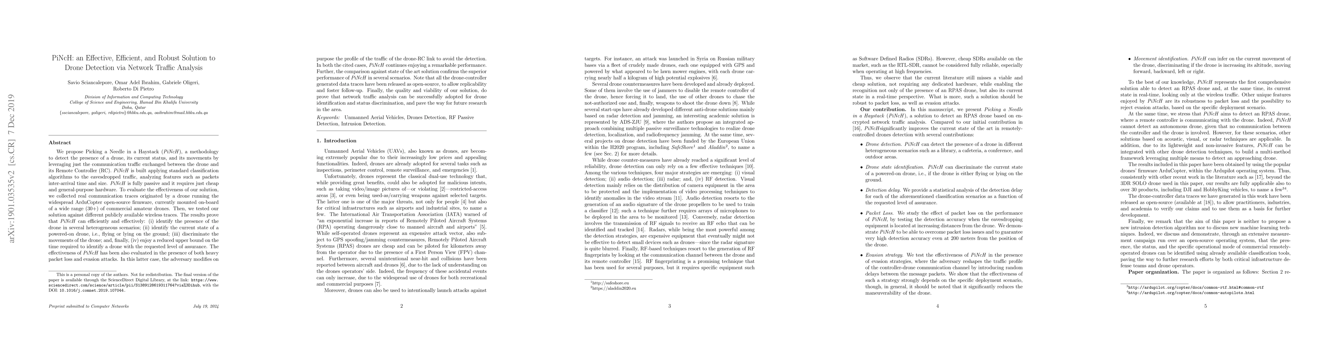 We propose PiNcH, a methodology to detect the presence of a drone, its current status, and its movements by leveraging just the communication traffic exchanged between the drone and its Remote Controller (RC). PiNcH is built applying standard classification algorithms to the eavesdropped traffic, analyzing features such as packets inter-arrival time and size. PiNcH is fully passive and it requires just cheap and general-purpose hardware. To evaluate the effectiveness of our solution, we collected real communication traces originated by a drone running the widespread ArduCopter open-source firmware, currently mounted on-board of a wide range (30+) of commercial amateur drones. We tested our solution against different publicly available wireless traces. The results prove that PiNcH can efficiently and effectively: (i) identify the presence of the drone in several heterogeneous scenarios; (ii) identify the current state of a powered-on drone, i.e., flying or lying on the ground; (iii) discriminate the movements of the drone; and, finally, (iv) enjoy a reduced upper bound on the time required to identify a drone with the requested level of assurance. The effectiveness of PiNcH has been also evaluated in the presence of both heavy packet loss and evasion attacks. In this latter case, the adversary modifies on purpose the profile of the traffic of the drone-RC link to avoid the detection. In both the cited cases, PiNcH continues enjoying a remarkable performance. Further, the comparison against state of the art solution confirms the superior performance of PiNcH in several scenarios. Note that all the drone-controller generated data traces have been released as open-source, to allow replicability and foster follow-up. Finally, the quality and viability of our solution, do prove that network traffic analysis can be successfully adopted for drone identification and status discrimination.
