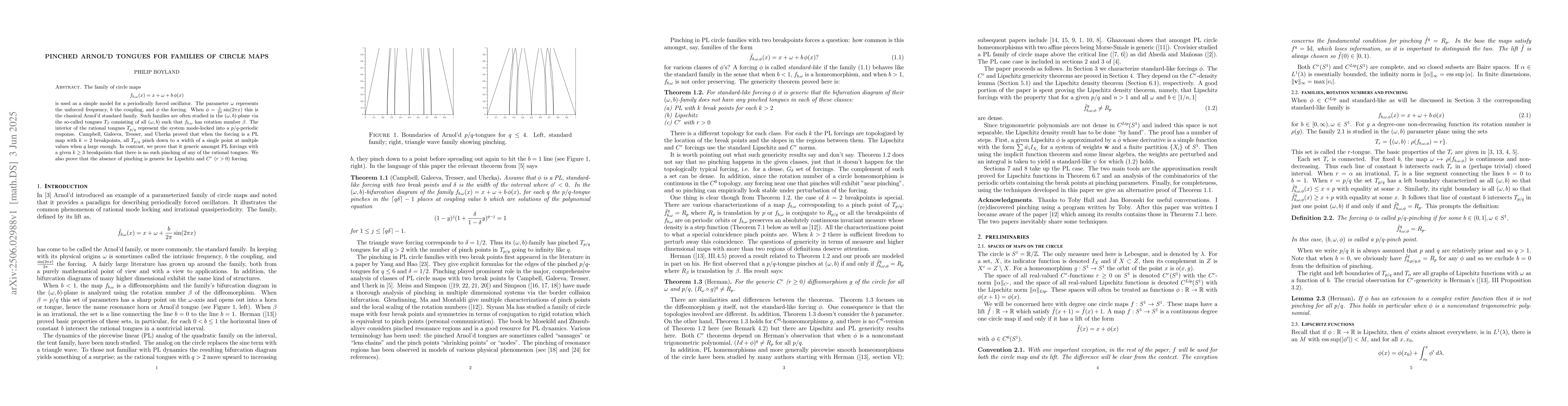 The paper proves the non-existence of pinching for rational tongues T_p/q in families of circle maps under broader conditions of forcing types (PL with k ≥ 3 breakpoints, Lipschitz, and C^r), extending previous results by Campbell et al.