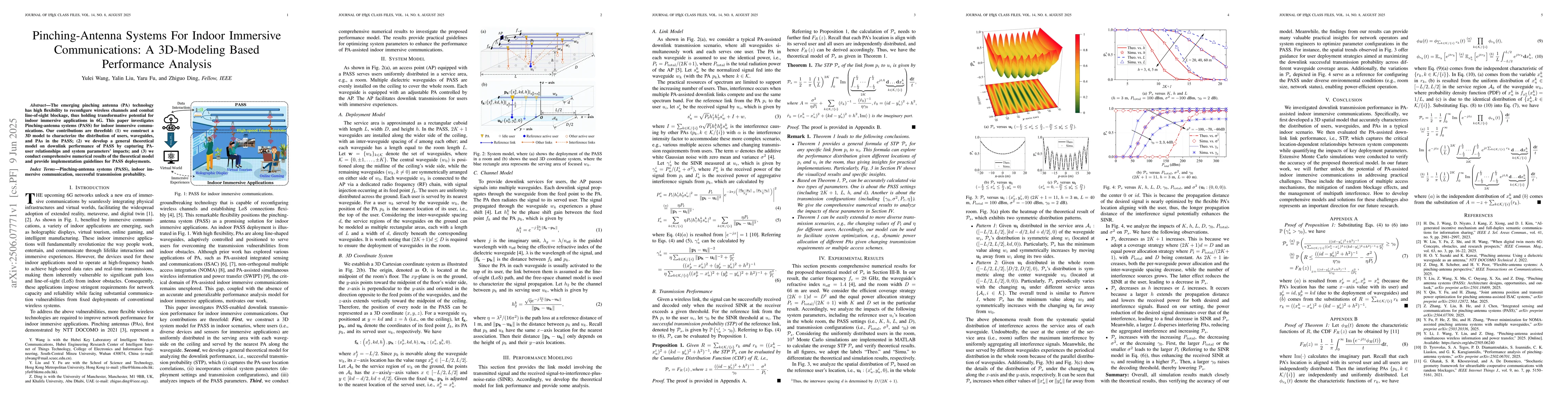 The emerging pinching antenna (PA) technology has high flexibility to reconfigure wireless channels and combat line-of-sight blockage, thus holding transformative potential for indoor immersive applications in 6G. This paper investigates Pinching-antenna systems (PASS) for indoor immersive communications. Our contributions are threefold: (1) we construct a 3D model to characterize the distribution of users, waveguides, and PAs in the PASS; (2) we develop a general theoretical model on downlink performance of PASS by capturing PA-user relationships and system parameters' impacts; and (3) we conduct comprehensive numerical results of the theoretical model and provide implementation guidelines for PASS deployments.