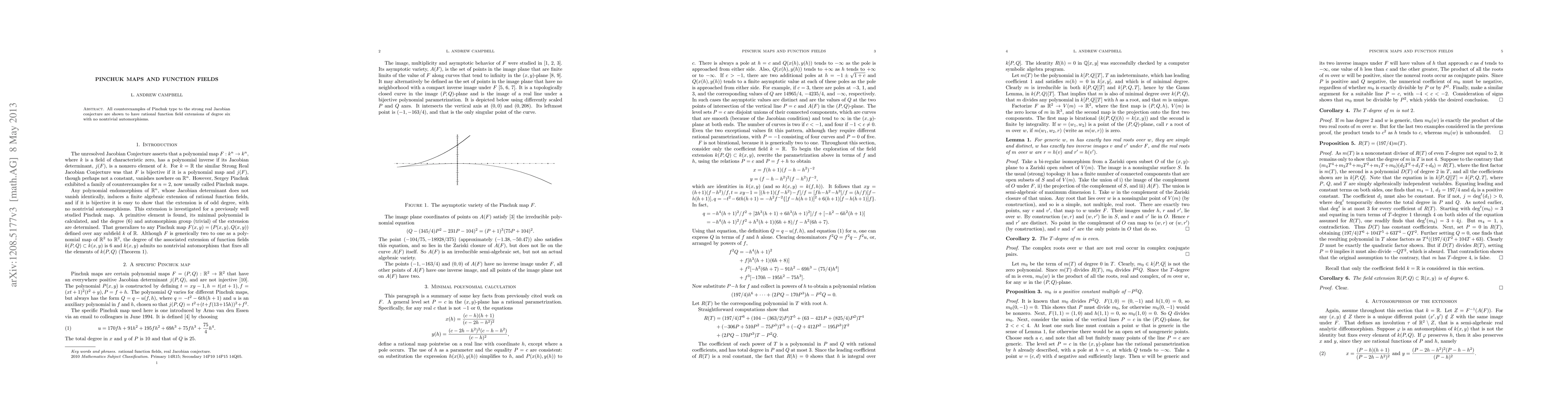 The paper analyzes Pinchuk maps using function fields, demonstrating that all Pinchuk-type counterexamples to the strong real Jacobian conjecture involve rational function field extensions of degree six with no nontrivial automorphisms.