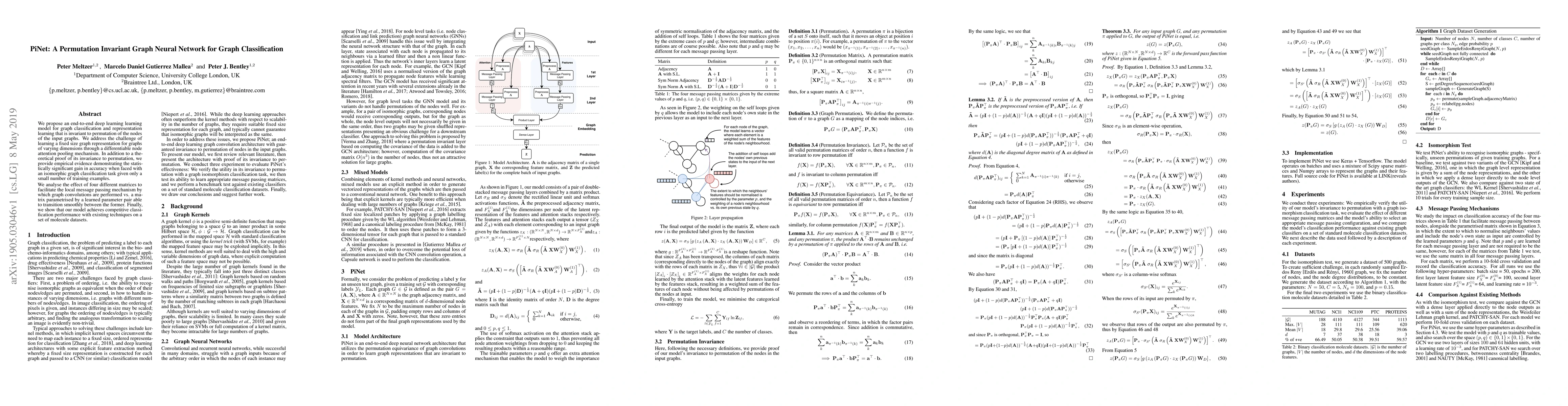PiNet is a permutation invariant graph neural network designed for graph classification, leveraging a differentiable node attention pooling mechanism to handle varying graph dimensions. The model demonstrates significant accuracy improvements in isomorphic graph classification tasks with limited training data and achieves competitive performance on molecule datasets.