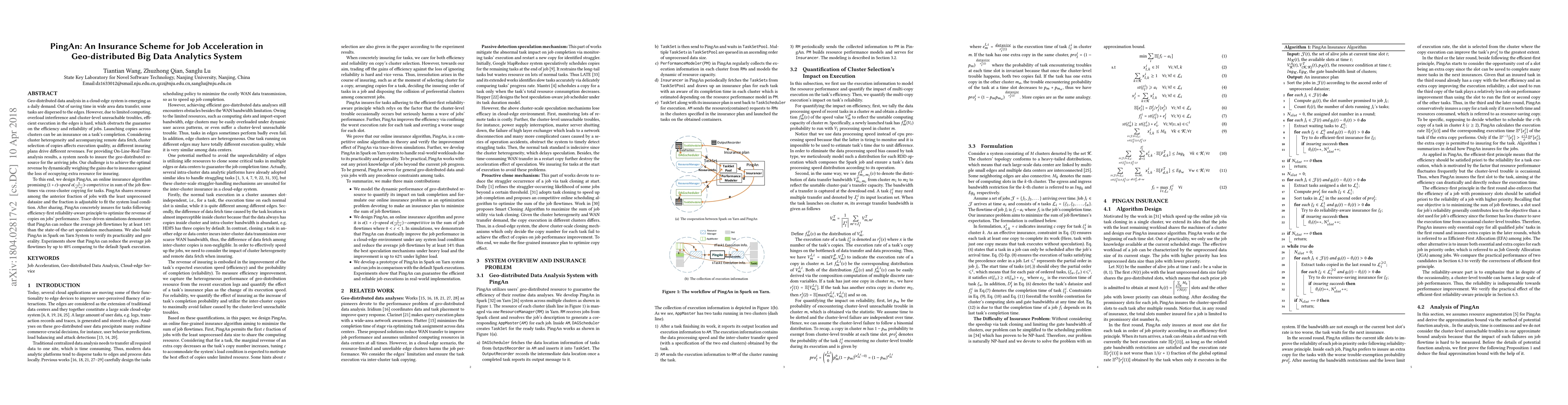 PingAn is an online insurance algorithm designed to optimize job execution in geo-distributed big data analytics systems by dynamically distributing task copies across clusters to ensure timely completion. It achieves a $(1+\varepsilon)\!\!-\!speed$ competitive ratio and reduces average job flowtimes by up to 40% compared to default Spark execution.