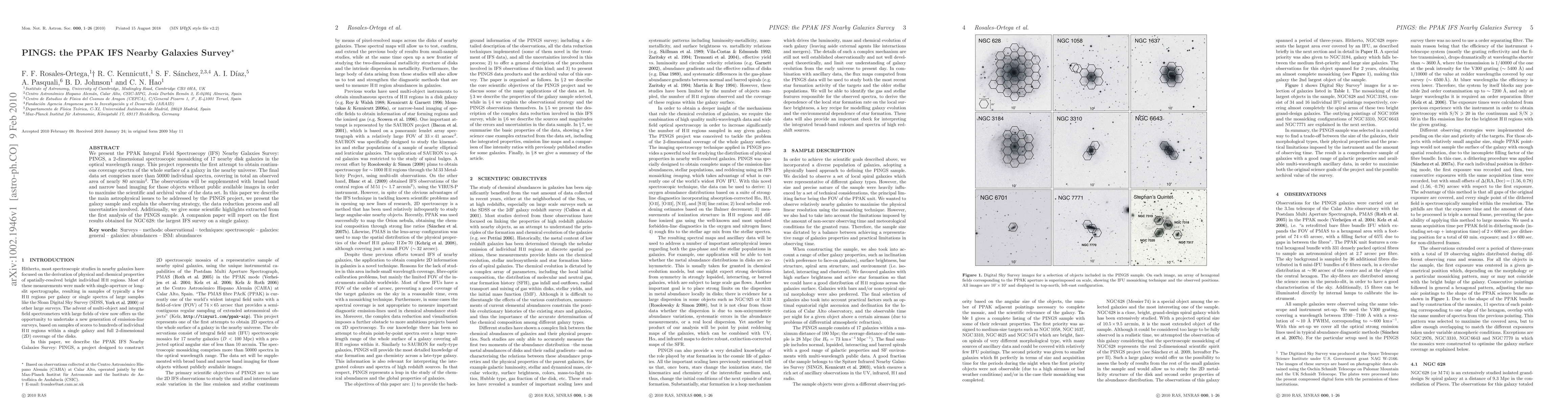 We present the PPAK Integral Field Spectroscopy (IFS) Nearby Galaxies Survey: PINGS, a 2-dimensional spectroscopic mosaicking of 17 nearby disk galaxies in the optical wavelength range. This project represents the first attempt to obtain continuous coverage spectra of the whole surface of a galaxy in the nearby universe. The final data set comprises more than 50000 individual spectra, covering in total an observed area of nearly 80 arcmin^2. In this paper we describe the main astrophysical issues to be addressed by the PINGS project, we present the galaxy sample and explain the observing strategy, the data reduction process and all uncertainties involved. Additionally, we give some scientific highlights extracted from the first analysis of the PINGS sample.