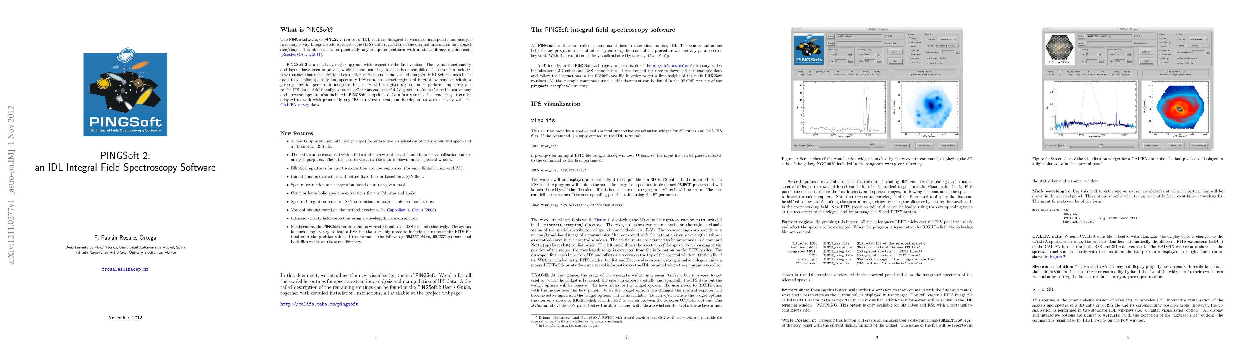 PINGSoft 2 is an advanced IDL-based software suite for visualizing and analyzing integral field spectroscopy data, featuring improved functionality, simplified command syntax, and enhanced spatial and spectral visualization. It is optimized for the CALIFA survey and is freely available for use on various platforms.
