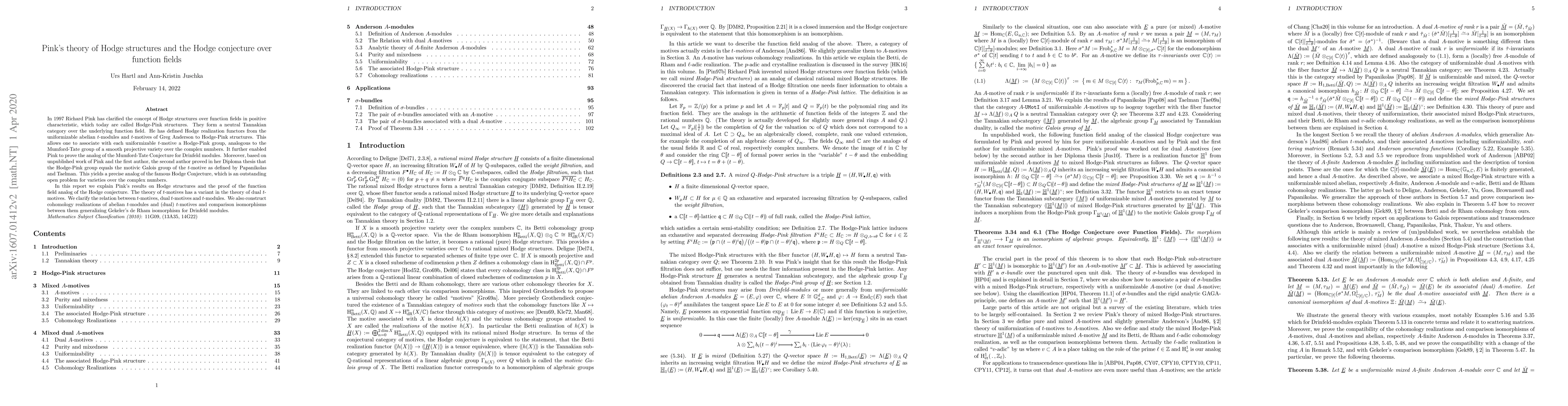 Summary: Richard Pink's theory of Hodge-Pink structures over function fields in positive characteristic establishes a neutral Tannakian category, defining Hodge realization functors for uniformizable abelian $t$-modules and $t$-motives. This work allows the association of Hodge-Pink groups to $t$-motives, proving an analog of the Mumford-Tate Conjecture and the Hodge Conjecture in function fields, and clarifies the relationship between $t$-motives, dual $t$-motives, and $t$-modules.