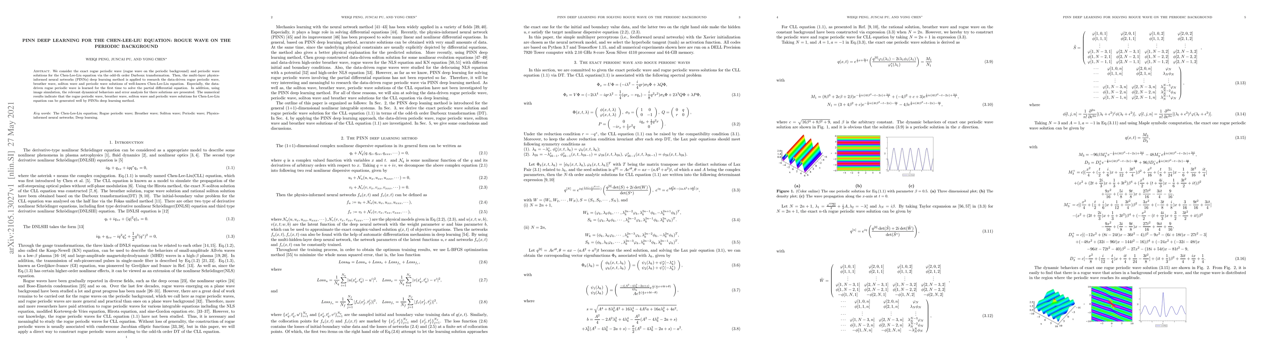 This paper employs multi-layer physics-informed neural networks (PINNs) to study the Chen-Lee-Liu equation, focusing on rogue periodic waves, breather waves, soliton waves, and periodic wave solutions. For the first time, it uses data-driven learning to predict rogue periodic waves, demonstrating the method's effectiveness through image simulations and error analysis.