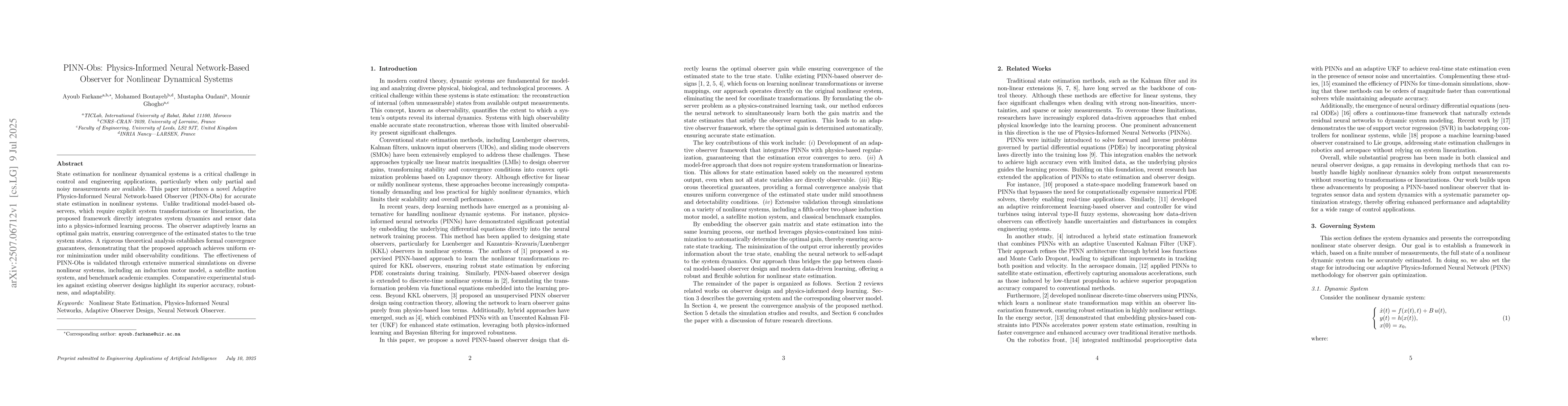State estimation for nonlinear dynamical systems is a critical challenge in control and engineering applications, particularly when only partial and noisy measurements are available. This paper introduces a novel Adaptive Physics-Informed Neural Network-based Observer (PINN-Obs) for accurate state estimation in nonlinear systems. Unlike traditional model-based observers, which require explicit system transformations or linearization, the proposed framework directly integrates system dynamics and sensor data into a physics-informed learning process. The observer adaptively learns an optimal gain matrix, ensuring convergence of the estimated states to the true system states. A rigorous theoretical analysis establishes formal convergence guarantees, demonstrating that the proposed approach achieves uniform error minimization under mild observability conditions. The effectiveness of PINN-Obs is validated through extensive numerical simulations on diverse nonlinear systems, including an induction motor model, a satellite motion system, and benchmark academic examples. Comparative experimental studies against existing observer designs highlight its superior accuracy, robustness, and adaptability.