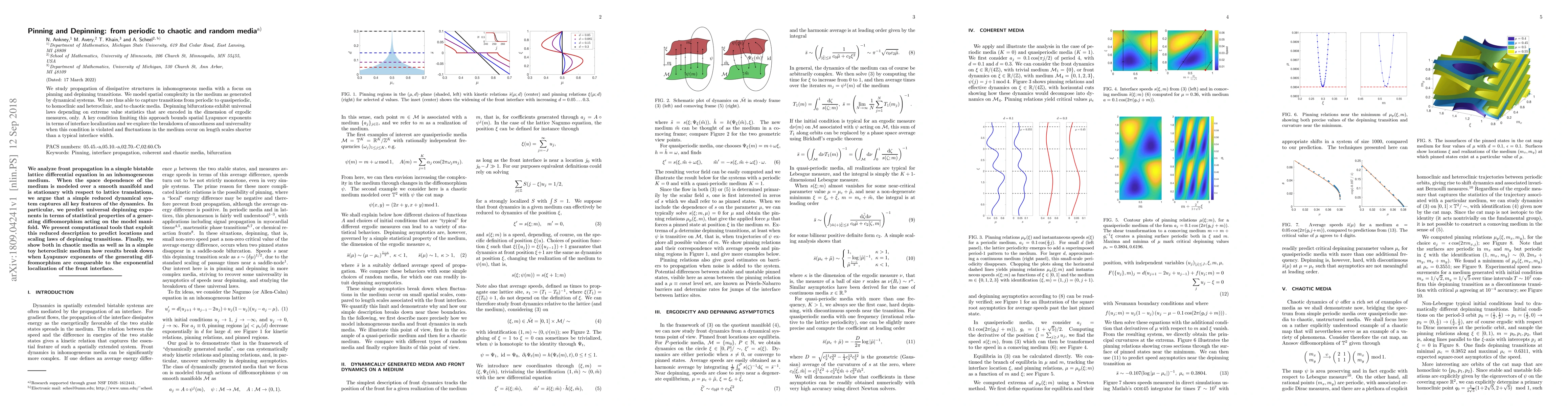 We study propagation of dissipative structures in inhomogeneous media with a focus on pinning and depinning transitions. We model spatial complexity in the medium as generated by dynamical systems. We are thus able to capture transitions from periodic to quasiperiodic, to homoclinic and heteroclinic, and to chaotic media. Depinning bifurcations exhibit universal laws depending on extreme value statistics that are encoded in the dimension of ergodic measures, only. A key condition limiting this approach bounds spatial Lyapunov exponents in terms of interface localization and we explore the breakdown of smoothness and universality when this condition is violated and fluctuations in the medium occur on length scales shorter than a typical interface width.