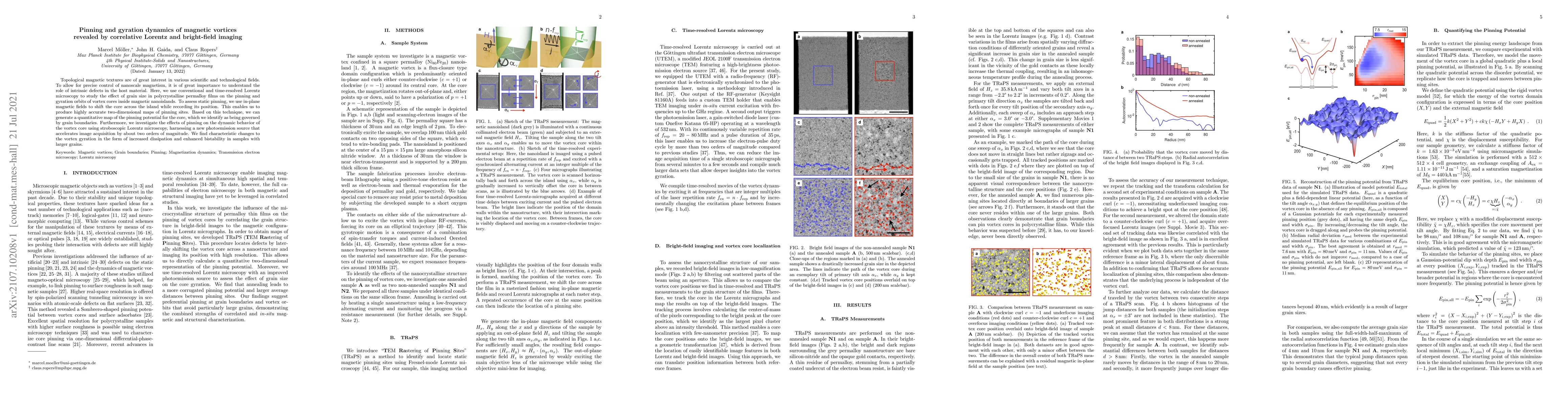 Topological magnetic textures are of great interest in various scientific and technological fields. To allow for precise control of nanoscale magnetism, it is of great importance to understand the role of intrinsic defects in the host material. Here, we use conventional and time-resolved Lorentz microscopy to study the effect of grain size in polycrystalline permalloy films on the pinning and gyration orbits of vortex cores inside magnetic nanoislands. To assess static pinning, we use in-plane magnetic fields to shift the core across the island while recording its position. This enables us to produce highly accurate two-dimensional maps of pinning sites. Based on this technique, we can generate a quantitative map of the pinning potential for the core, which we identify as being governed by grain boundaries. Furthermore, we investigate the effects of pinning on the dynamic behavior of the vortex core using stroboscopic Lorentz microscopy, harnessing a new photoemission source that accelerates image acquisition by about two orders of magnitude. We find characteristic changes to the vortex gyration in the form of increased dissipation and enhanced bistability in samples with larger grains.