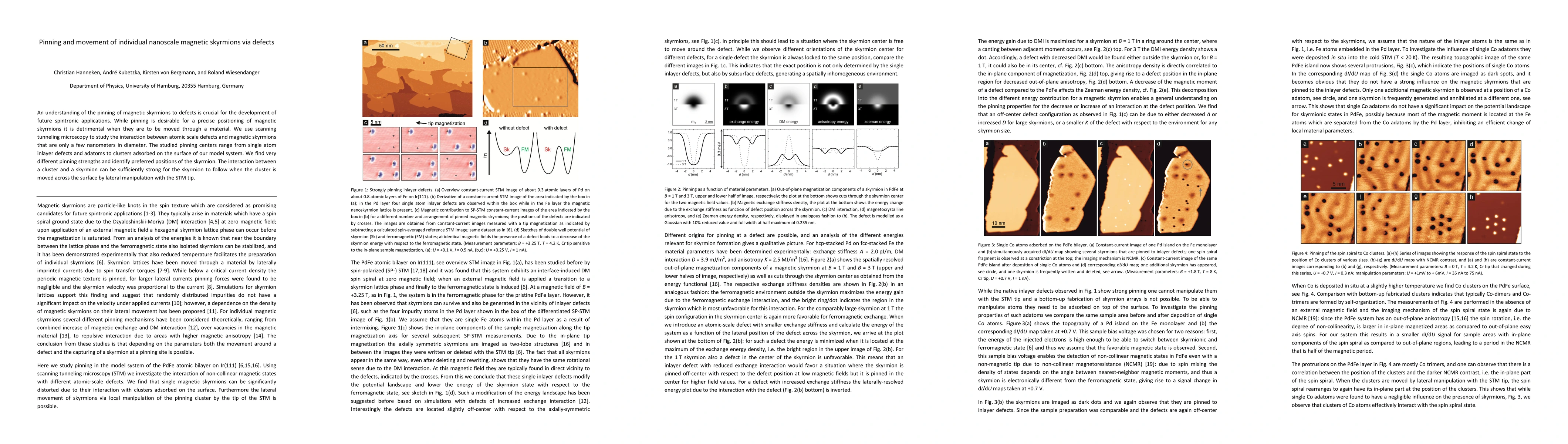 This study explores how nanoscale defects pin and influence the movement of magnetic skyrmions using scanning tunneling microscopy. The research identifies varying pinning strengths and preferred skyrmion positions relative to different defect types, revealing that clusters can be manipulated to move skyrmions across the material surface.