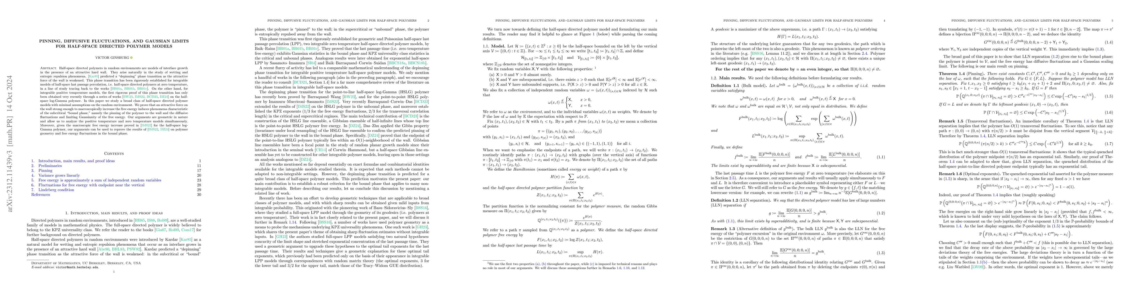 This paper investigates half-space directed polymer models, proving that a sufficiently strong attractive force on the wall induces polymer pinning, diffusive fluctuations, and Gaussian limits for the free energy, applicable to both positive and zero temperature models. The geometric arguments used also reprove recent results on polymer geometry and free energy fluctuations in the bound phase.
