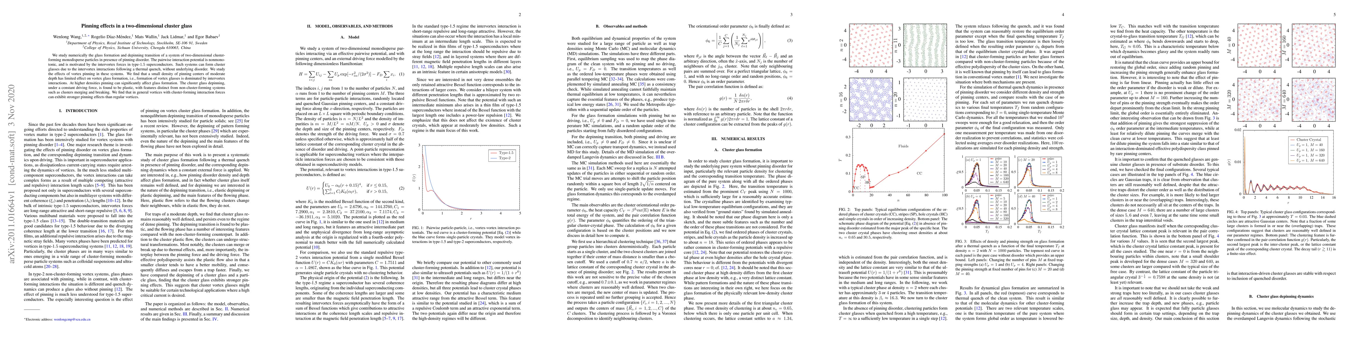 We study numerically the glass formation and depinning transition of a system of two-dimensional cluster-forming monodisperse particles in presence of pinning disorder. The pairwise interaction potential is nonmonotonic, and is motivated by the intervortex forces in type-$1.5$ superconductors. Such systems can form cluster glasses due to the intervortex interactions following a thermal quench, without underlying disorder. We study the effects of vortex pinning in these systems. We find that a small density of pinning centers of moderate depth has limited effect on vortex glass formation, i.e., formation of vortex glasses is dominated by intervortex interactions. At higher densities pinning can significantly affect glass formation. The cluster glass depinning, under a constant driving force, is found to be plastic, with features distinct from non-cluster-forming systems such as clusters merging and breaking. We find that in general vortices with cluster-forming interaction forces can exhibit stronger pinning effects than regular vortices.