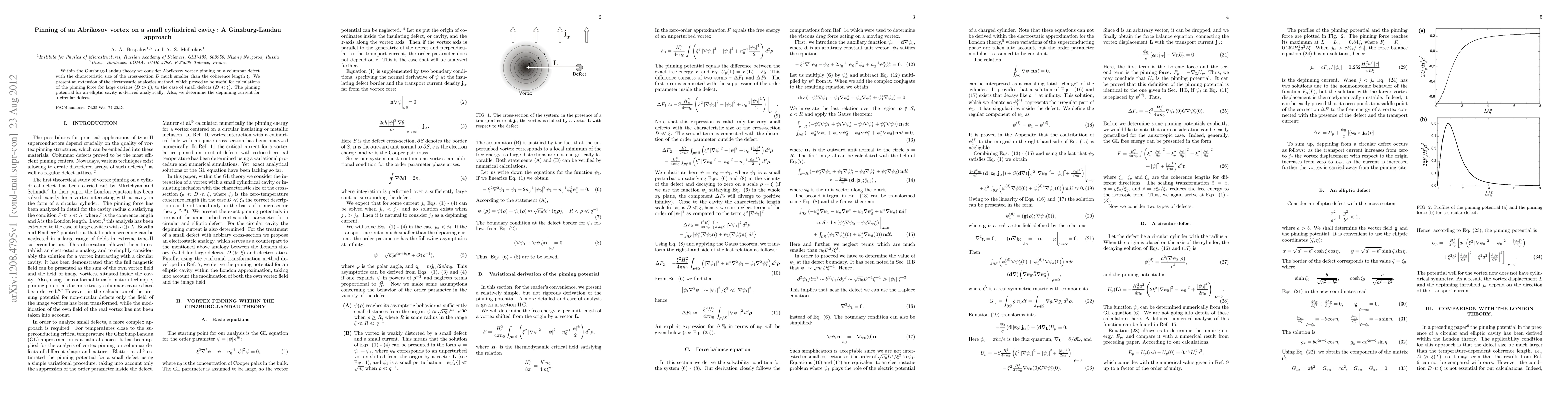 This study employs Ginzburg-Landau theory to analyze Abrikosov vortex pinning on small cylindrical columnar defects, extending the electrostatic analogies method for pinning force calculations. It derives the pinning potential for elliptic cavities analytically and determines the depinning current for circular defects.