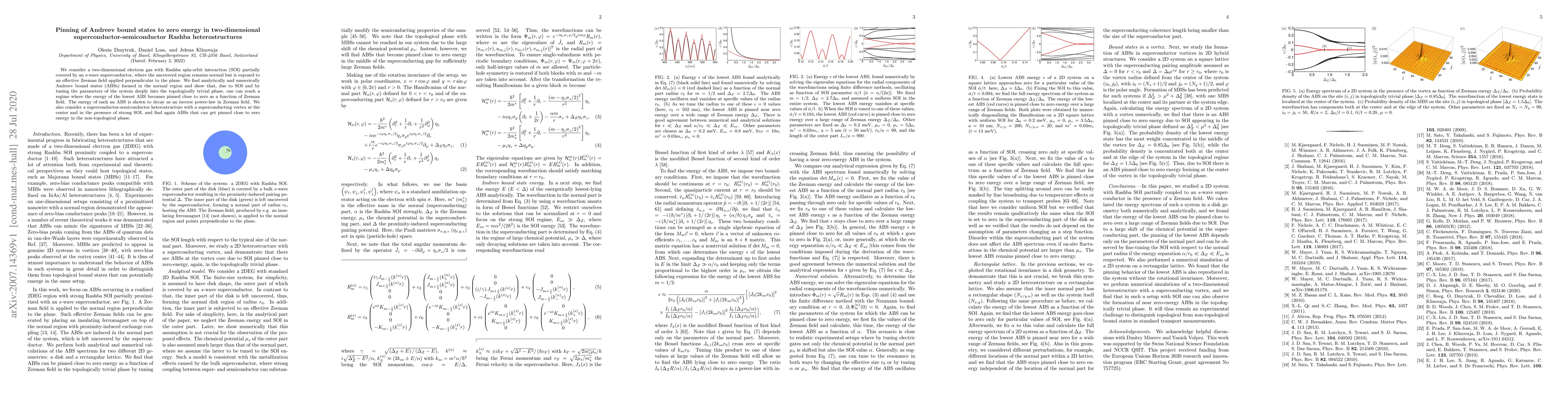 This paper investigates the pinning of Andreev bound states (ABSs) near zero energy in two-dimensional electron systems with Rashba spin-orbit interaction, partially covered by an s-wave superconductor. The study reveals that ABSs can be pinned close to zero energy by tuning system parameters, even in topologically trivial phases, and their energy decays inversely with the applied Zeeman field.