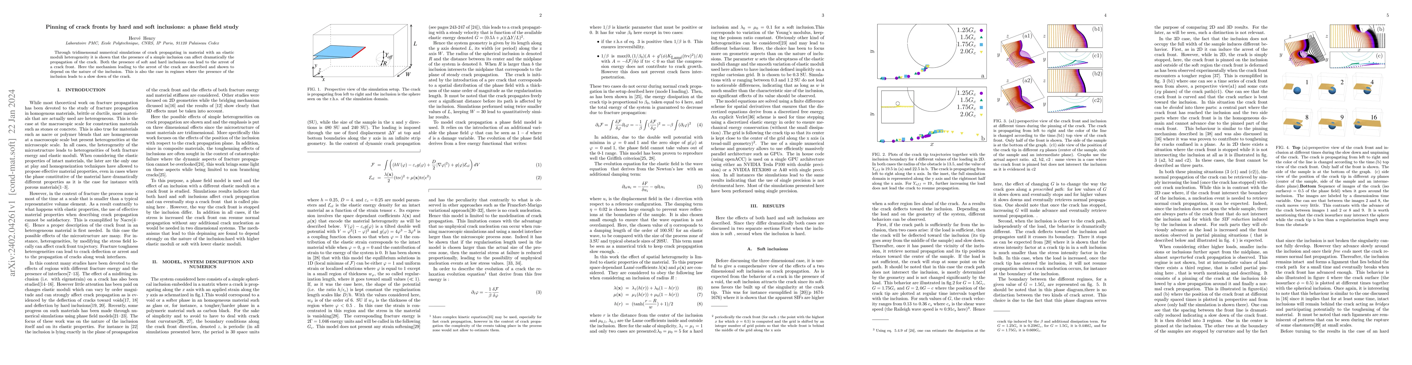 Through tridimensonal numerical simulations of crack propagating in material with an elastic moduli heterogeneity it is shown that the presence of a simple inclusion can affect dramatically the propagation of the crack. Both the presence of soft and hard inclusions can lead to the arrest of a crack front. Here the mechanism leading to the arrest of the crack are described and shown to depend on the nature of the inclusion. This is also the case in regimes where the presence of the inclusion leads to a slow down of the crack.