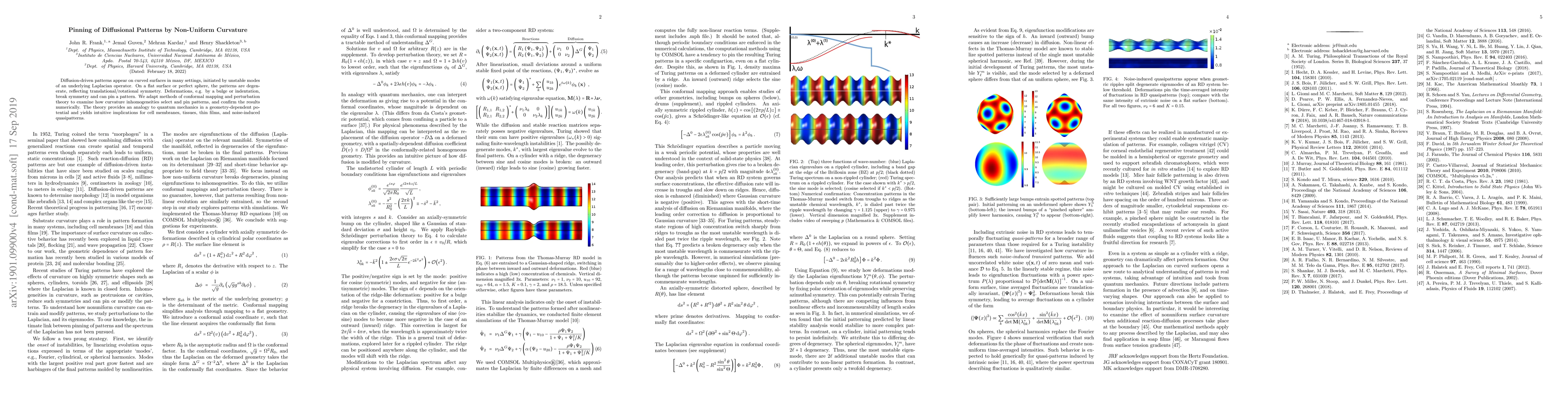 This research uses conformal mapping and perturbation theory to show how curvature inhomogeneities on surfaces select and pin diffusion-driven patterns, drawing an analogy to quantum mechanics in a geometry-dependent potential. The findings offer insights into cell membranes, tissues, thin films, and noise-induced quasipatterns.