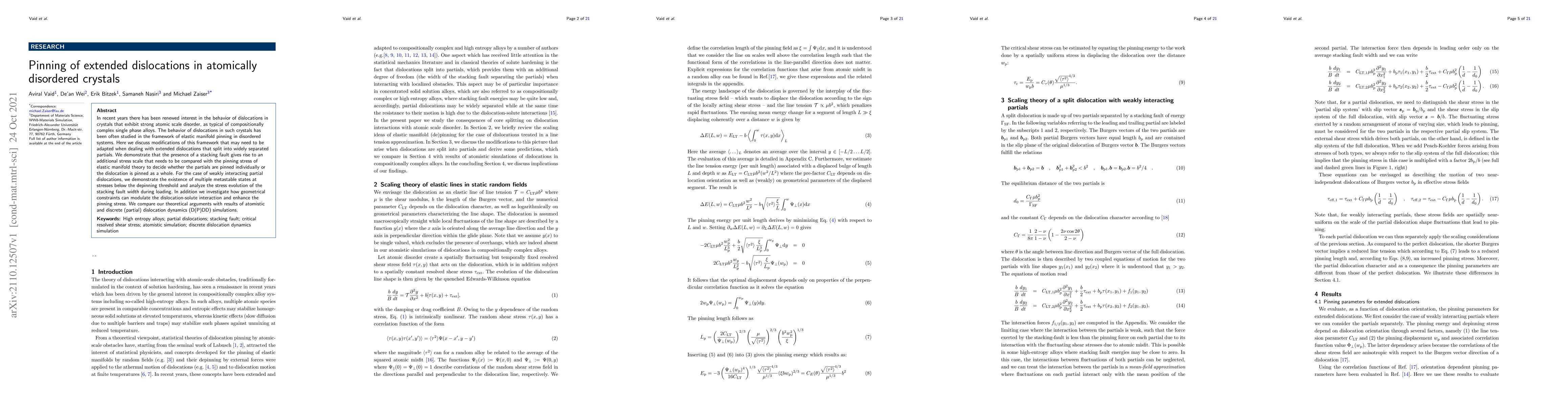 This paper explores the behavior of extended dislocations in atomically disordered crystals, focusing on the pinning mechanisms that govern their motion. It introduces a new framework for understanding how stacking faults influence the pinning stress, demonstrating the existence of multiple metastable states and the impact of geometrical constraints on dislocation-solute interactions. Theoretical arguments are supported by atomistic and discrete dislocation dynamics simulations.