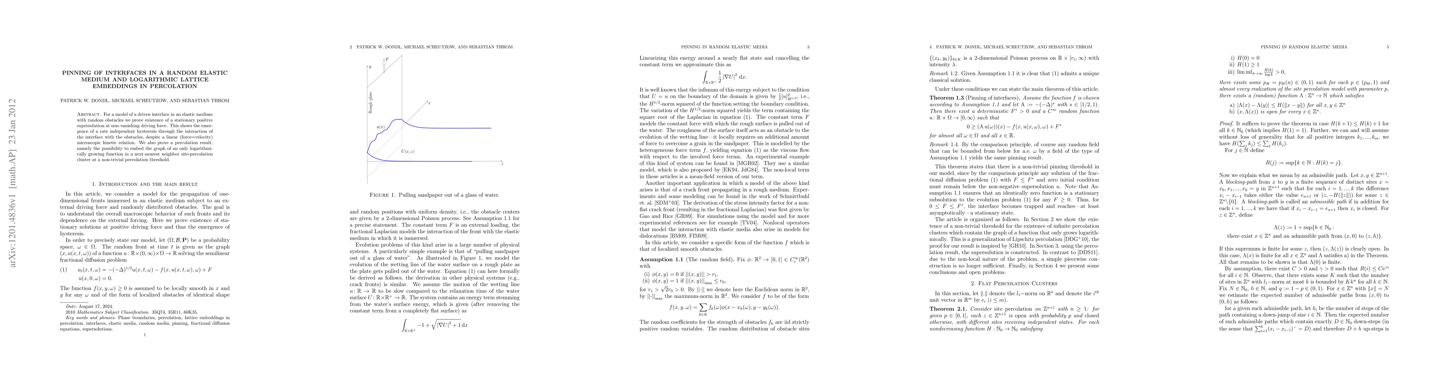 For a model of a driven interface in an elastic medium with random obstacles we prove existence of a stationary positive supersolution at non-vanishing driving force. This shows the emergence of a rate independent hysteresis through the interaction of the interface with the obstacles, despite a linear (force=velocity) microscopic kinetic relation. We also prove a percolation result, namely the possibility to embed the graph of an only logarithmically growing function in a next-nearest neighbor site-percolation cluster at a non-trivial percolation threshold.