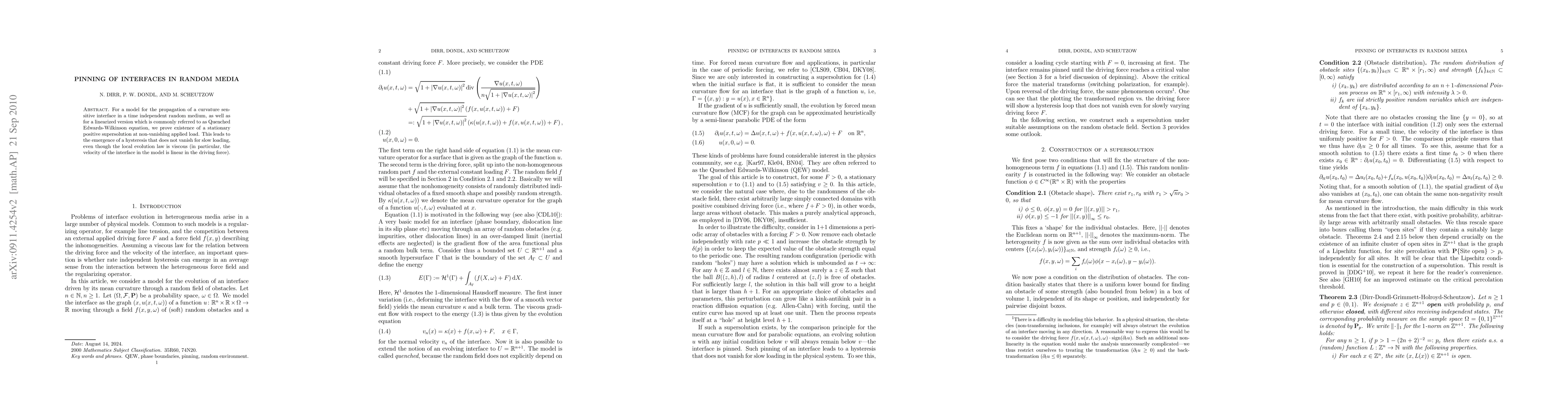 For a model for the propagation of a curvature sensitive interface in a time independent random medium, as well as for a linearized version which is commonly referred to as Quenched Edwards-Wilkinson equation, we prove existence of a stationary positive supersolution at non-vanishing applied load. This leads to the emergence of a hysteresis that does not vanish for slow loading, even though the local evolution law is viscous (in particular, the velocity of the interface in the model is linear in the driving force).