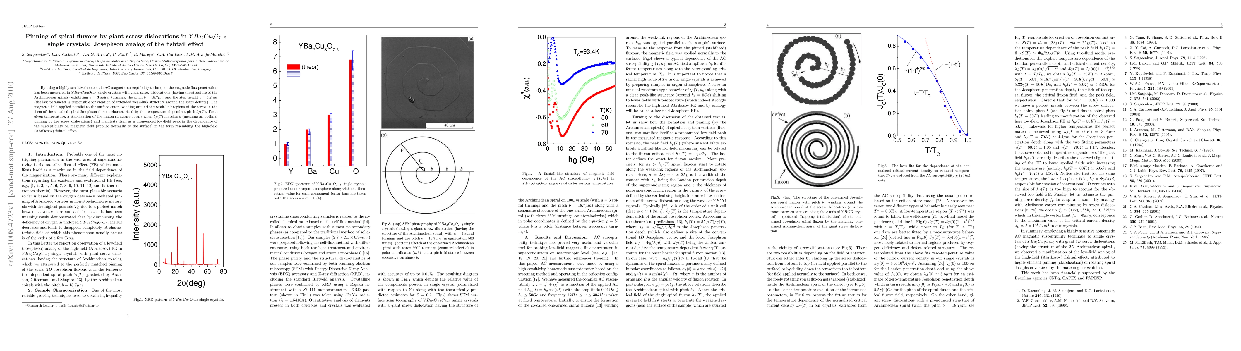By using a highly sensitive homemade AC magnetic susceptibility technique, the magnetic flux penetration has been measured in YBa_2Cu_3O_7 single crystals with giant screw dislocations (having the structure of the Archimedean spirals) exhibiting a=3 spiral turnings, the pitch b=18.7 microns and the step height c=1.2nm (the last parameter is responsible for creation of extended weak-link structure around the giant defects). The magnetic field applied parallel to the surface enters winding around the weak-link regions of the screw in the form of the so-called spiral Josephson fluxons characterized by the temperature dependent pitch b_f(T). For a given temperature, a stabilization of the fluxon structure occurs when b_f(T) matches b (meaning an optimal pinning by the screw dislocations) and manifests itself as a pronounced low-field peak in the dependence of the susceptibility on magnetic field (applied normally to the surface) in the form resembling the high-field (Abrikosov) fishtail effect.