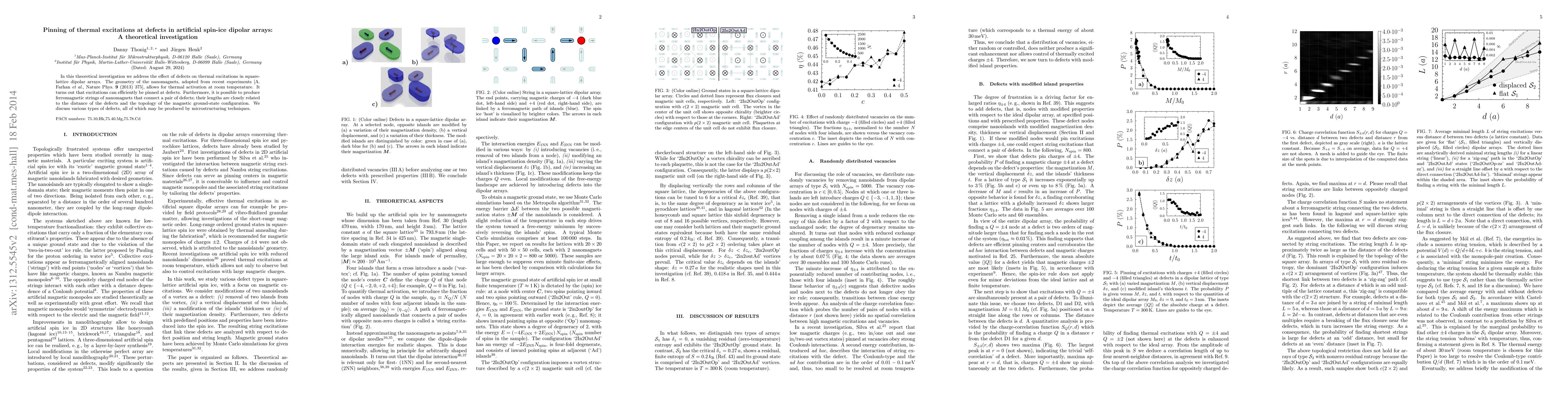This paper theoretically investigates how defects in artificial spin-ice dipolar arrays affect thermal excitations, finding that excitations can be pinned efficiently at defects. Ferromagnetic strings connecting defect pairs are also discussed, with their lengths dependent on defect distance and magnetic ground-state configuration.
