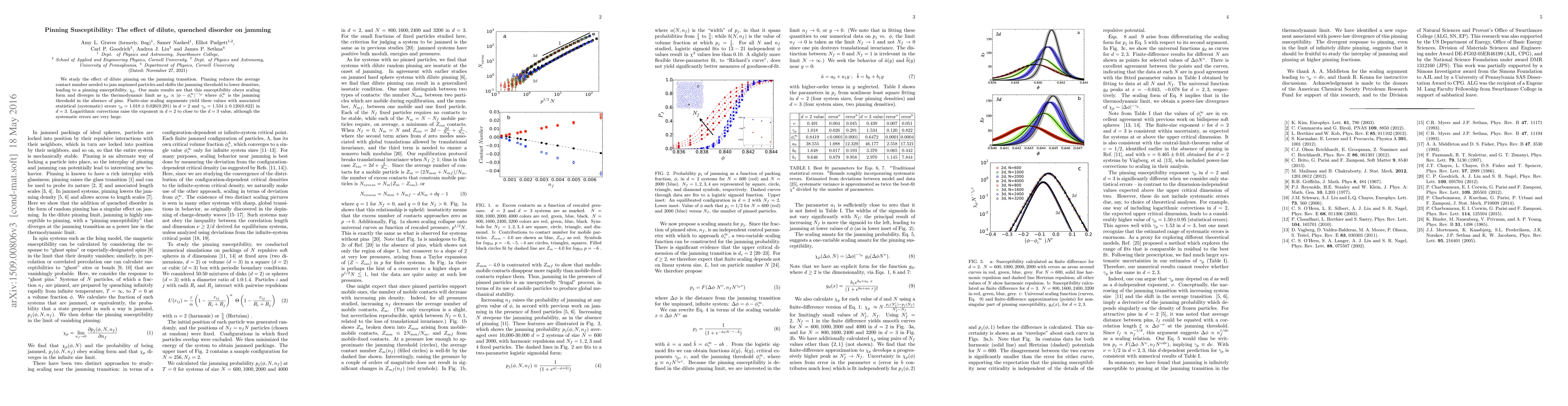 Research finds that adding dilute pins to particles can shift the jamming transition to lower densities and increases a measure of susceptibility to pinning. The effect follows a scaling form, with exponents differing slightly between two- and three-dimensional systems.